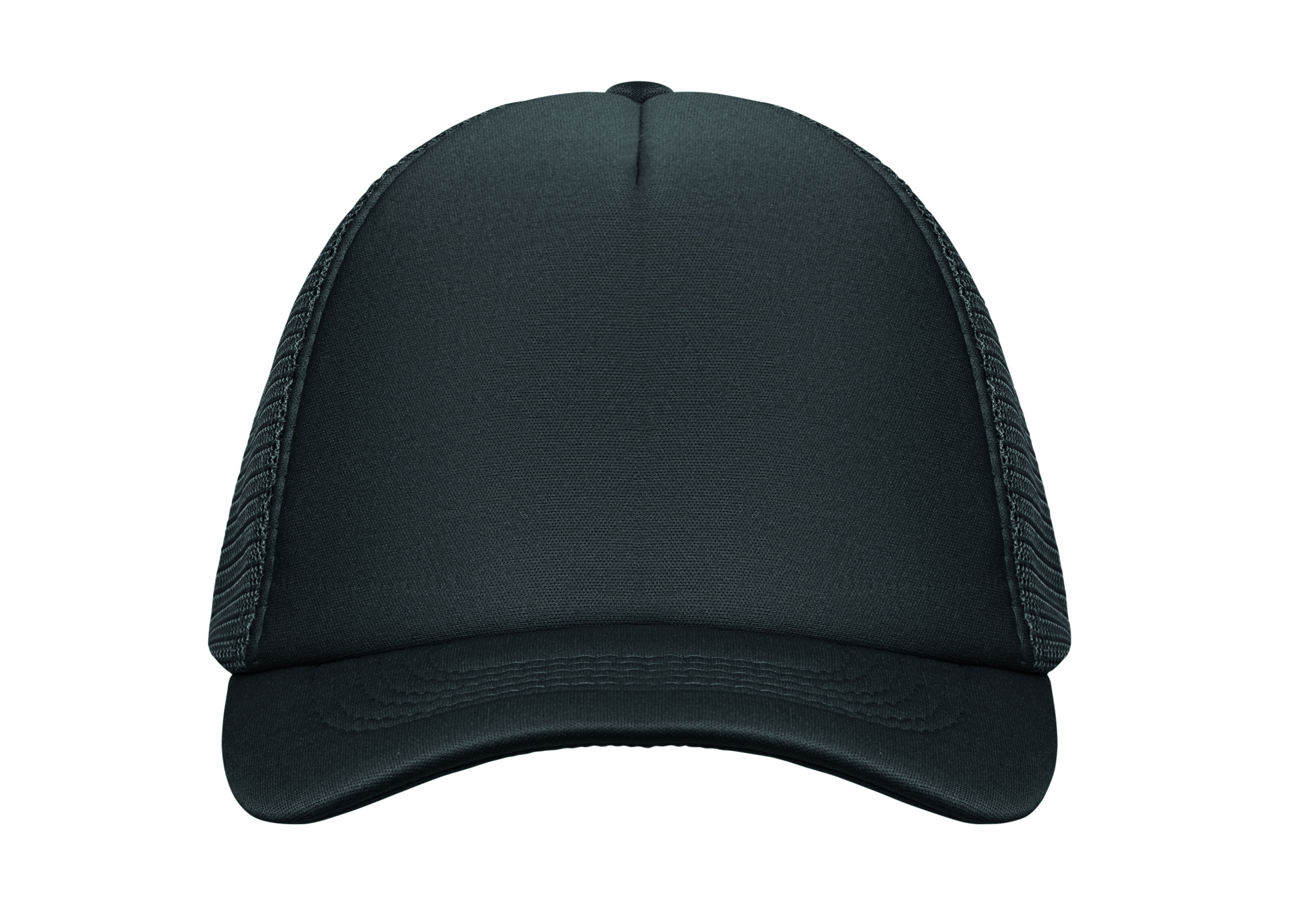 5 panel truckers cap in polyester 140-150 gr/m² with adjustment plastic snap closure. White front panel and color visor in polyester jersey with foam backing. Other panels in color mesh. Size 7 1/4.