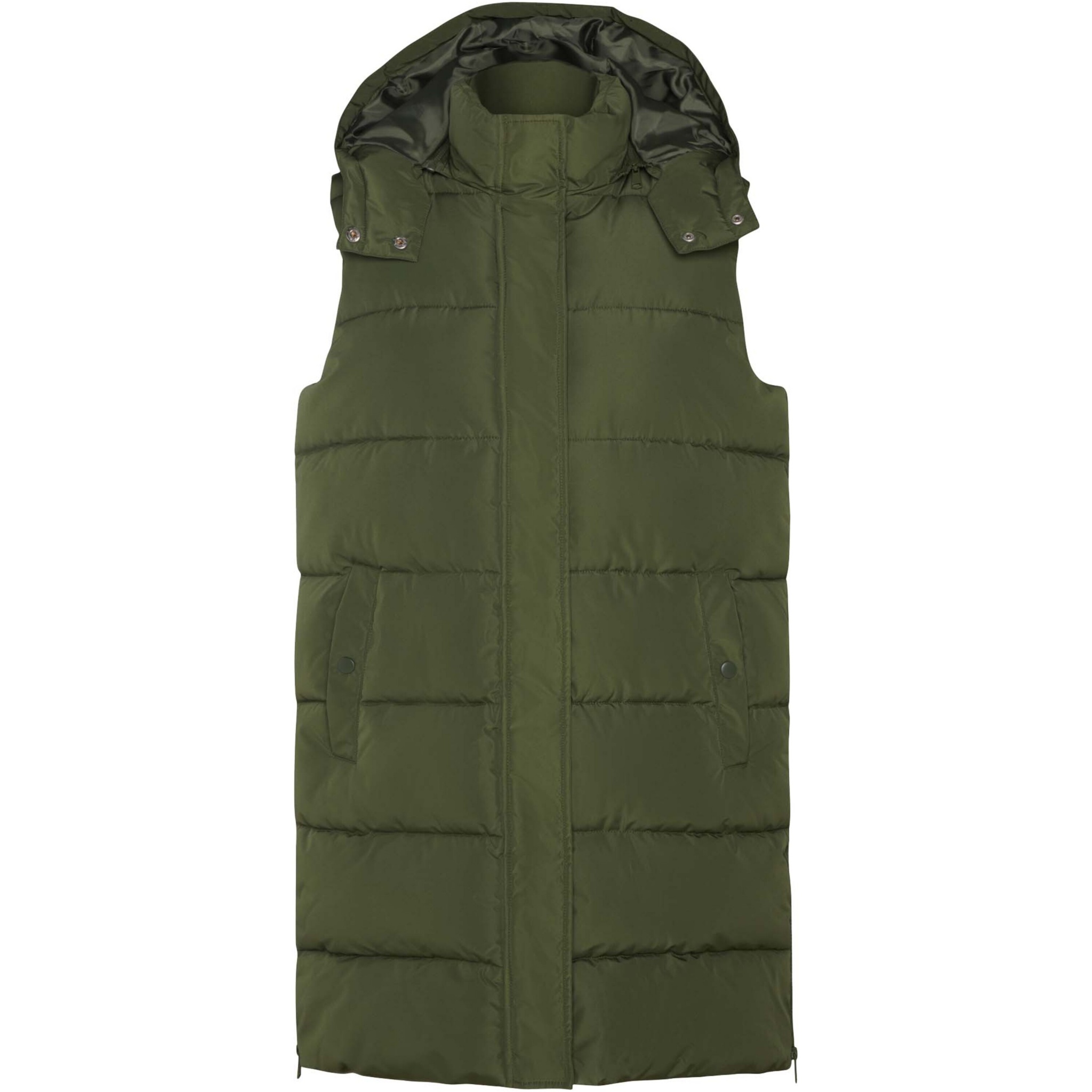 Мягкий утеплитель со съемным капюшоном. Высокий воротник. Передняя застежка-молния скрыта заслонкой. Два кармана с застежкой на кнопку. Боковые отверстия на молниях. Внутренний доступ к груди. Водоотталкивающая.