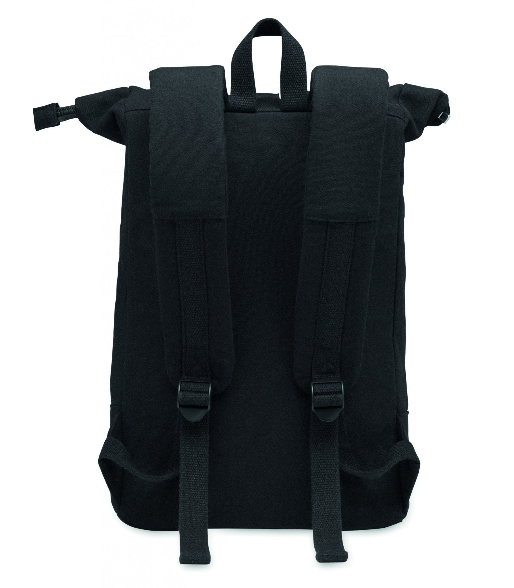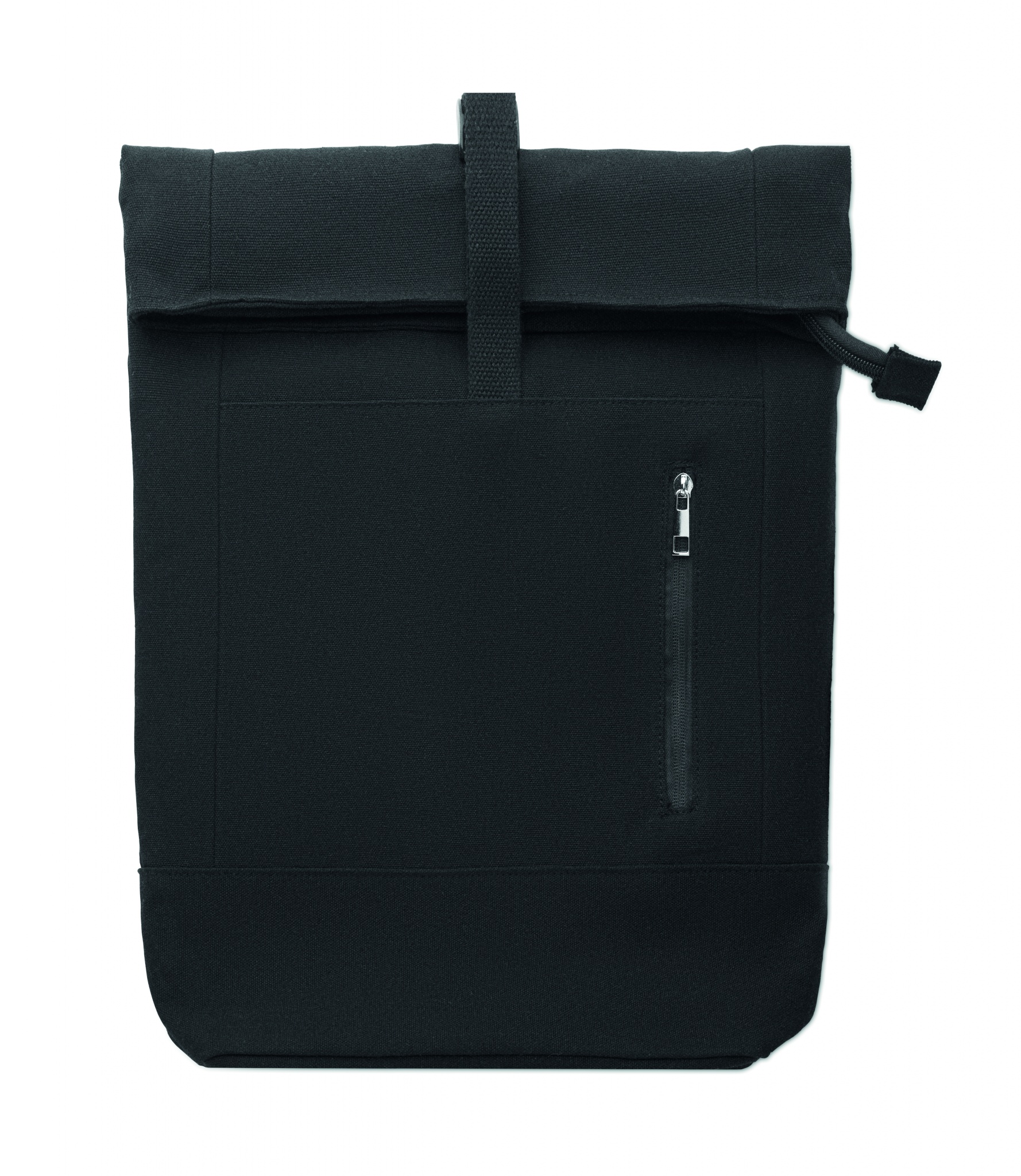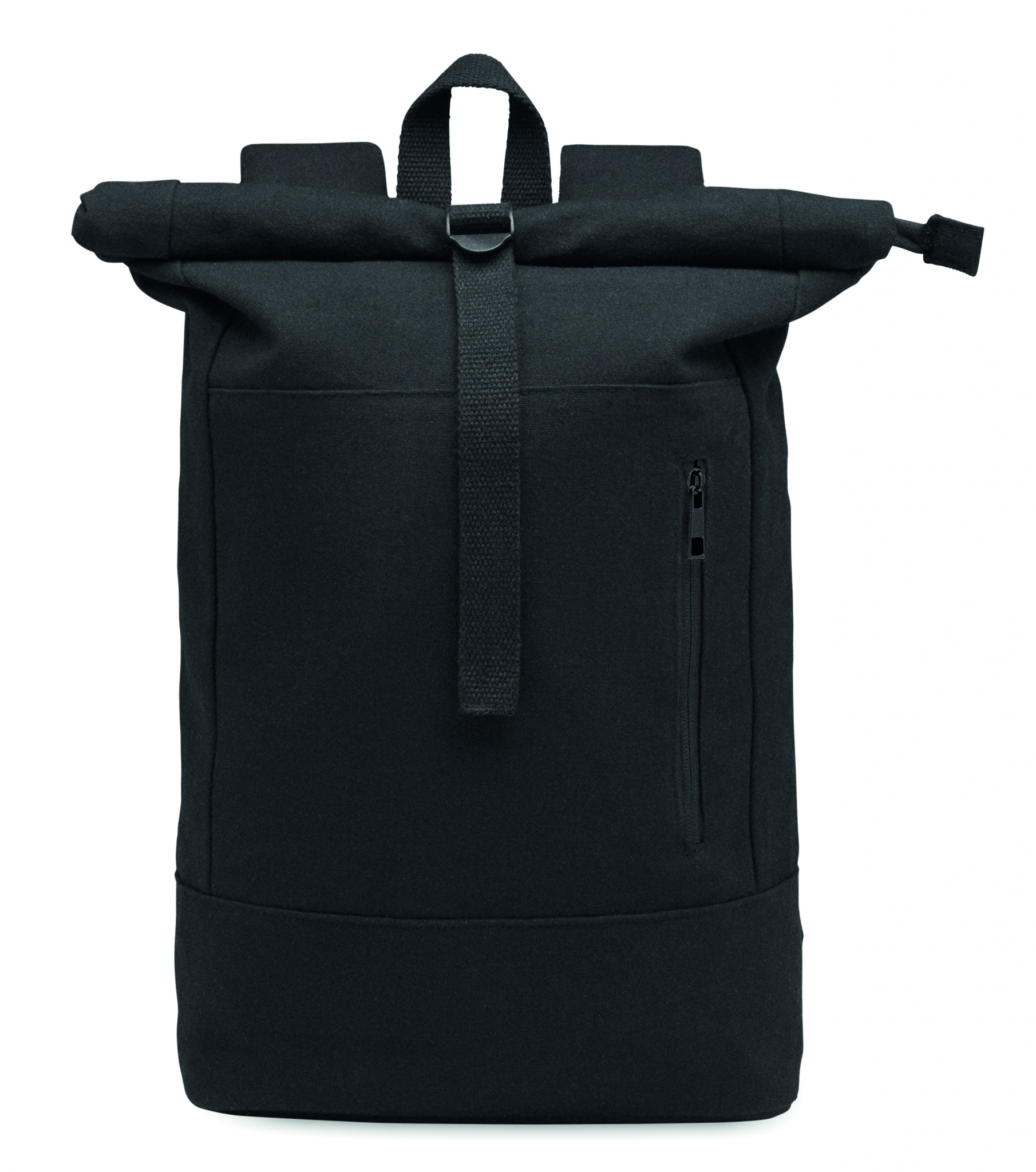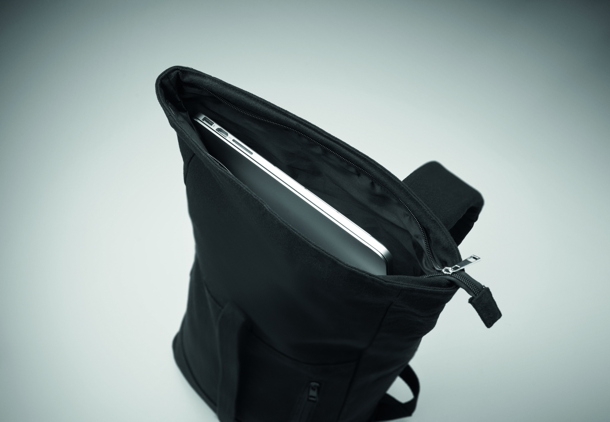 15'' dataryggsäck med dragkedja och rullstägning i återvunnen bomull och återvunnen polyester (70%/30%). Ficka med dragkedja på framsidan. Vadderad rygg och axelremmar. 340gr/m².