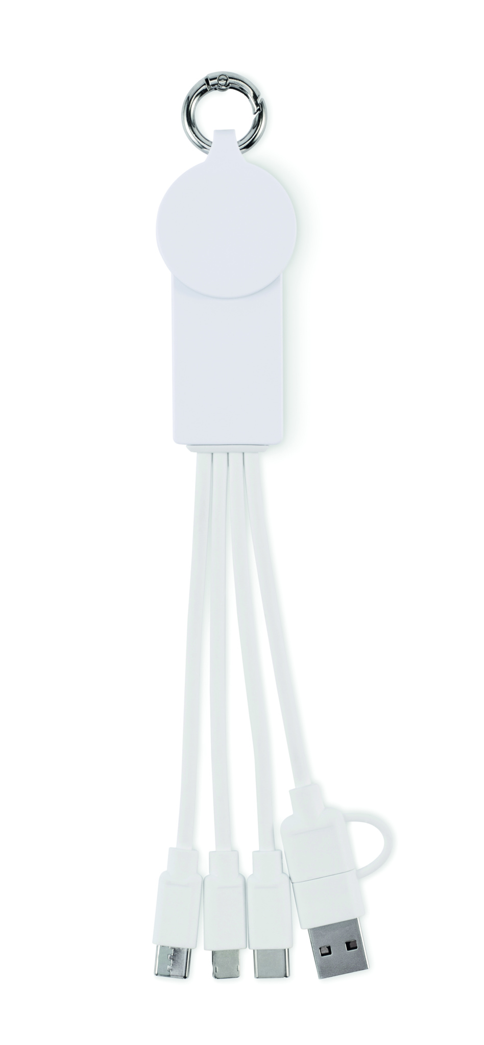 Nyckelring med laddningskabel med ingång: 2-i-1 typ-C & typ-A. Utgång: Laddning av klocka (Samsung® och Apple®), 2 x typ-C och micro-B (2 i 1 stift). Kabeln är tillverkad av återvunnen TPE.
