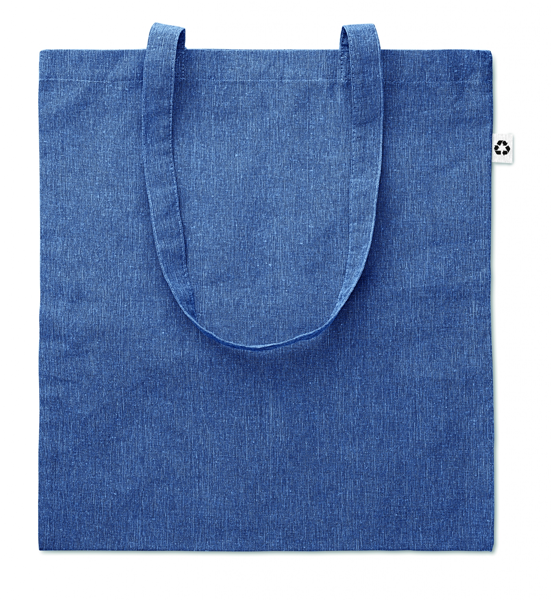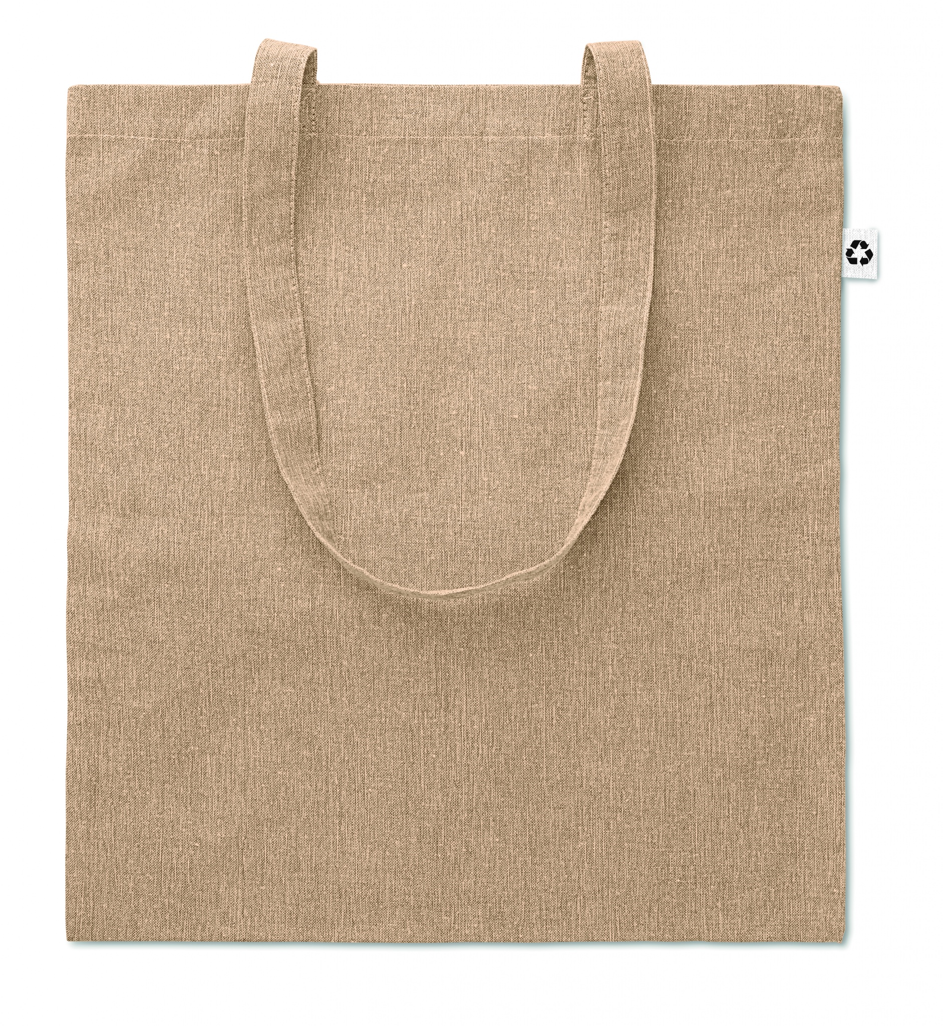 Tygkasse i tvåfärgad återvunnen bomull och återvunnen polyester med långa handtag (20%/80%). Ca 140gr/m². Den här artikeln kan krympa efter tryckning.