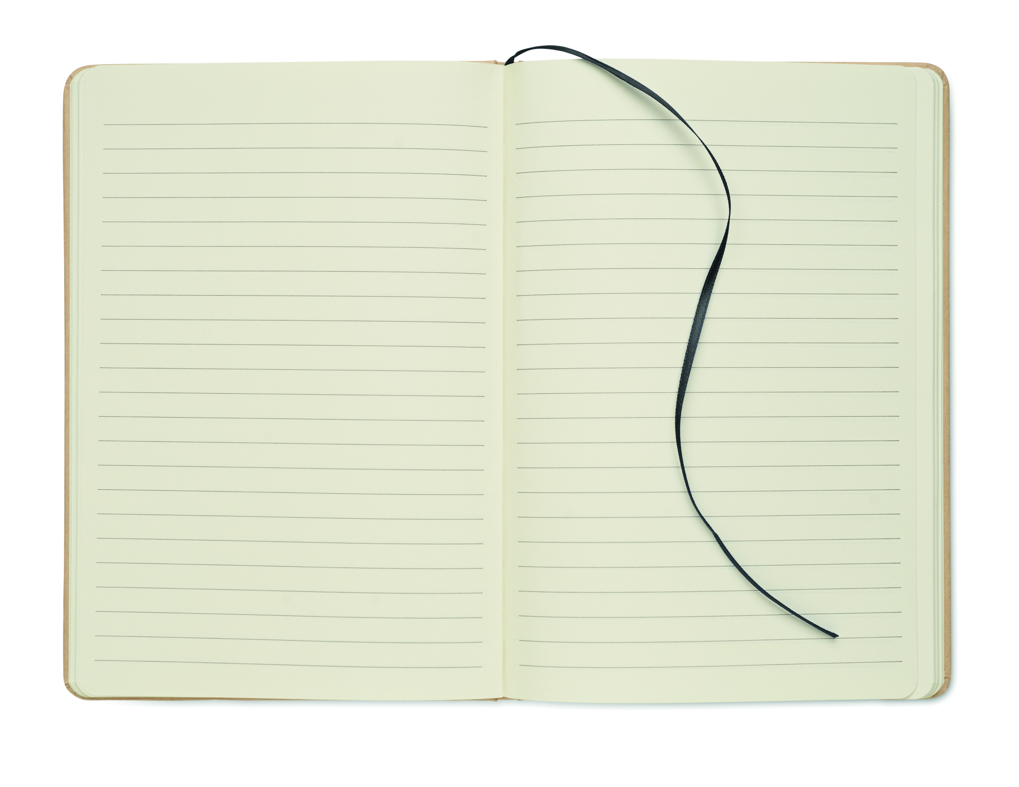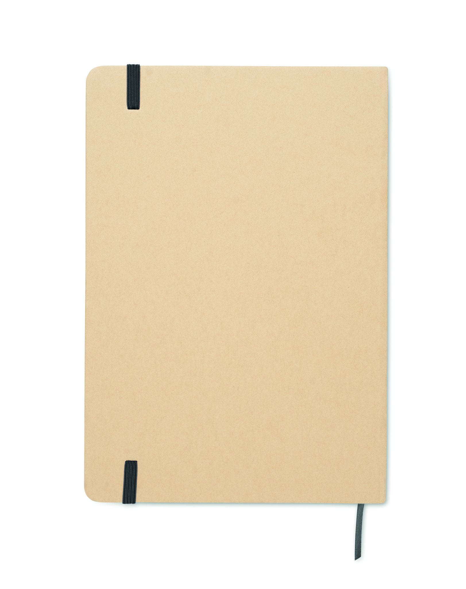 A5 anteckningsbok med omslag av hård återvunnen kartong. Beige omslag. Inbunden med 160 linjerade sidor av återvunnet papper (80 ark). Elastiskt stängnings- och läsband matchar den underliggande färgen. Efter lasergraveringen kommer logon att träda fram i samma färg som bandet.