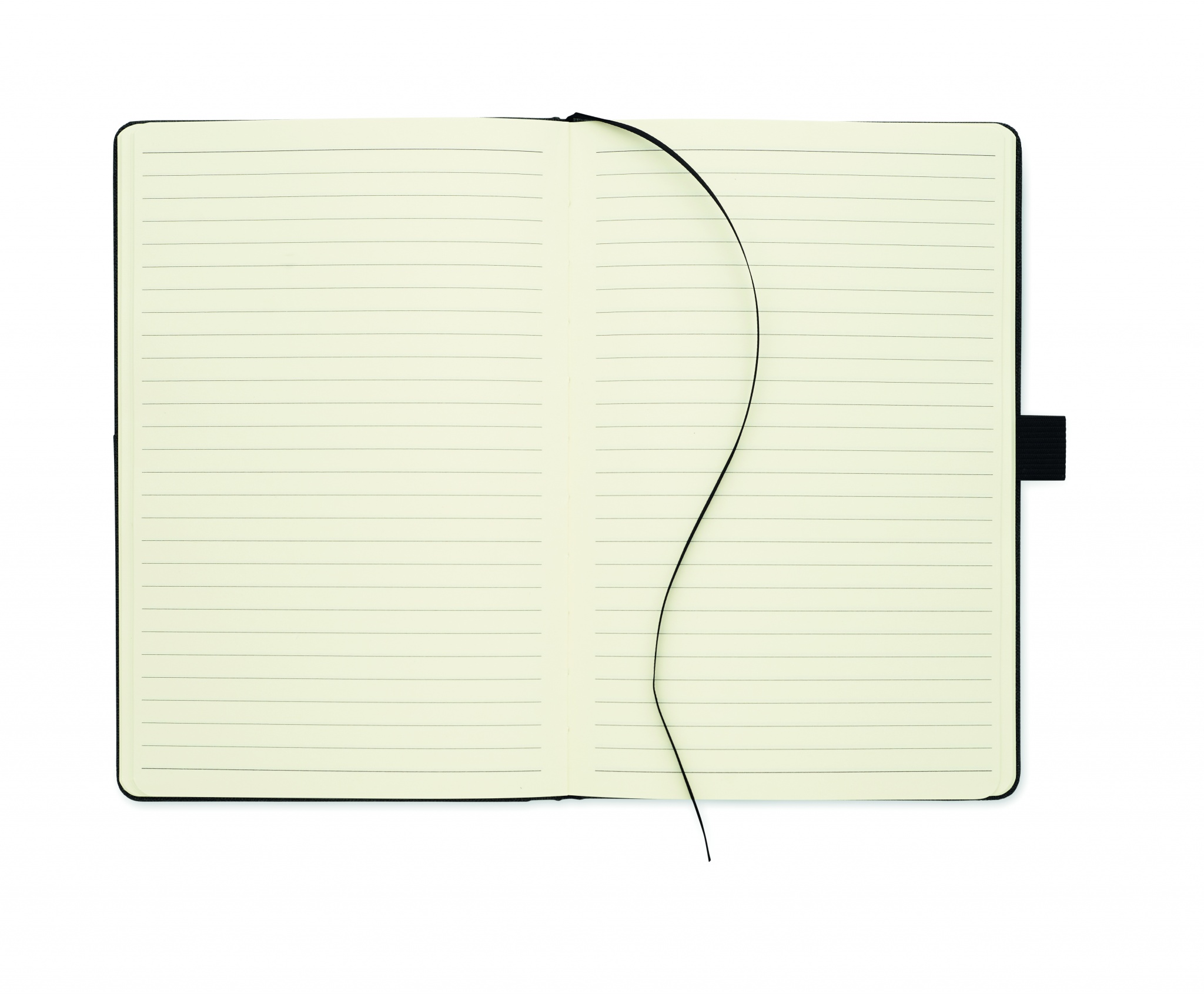 A5 anteckningsbok med hårt PU-omslag och främre telefonficka. Inbunden i kassett. 160 linjerade sidor av återvunnet papper (80 ark). Matchande bokmärke i band.