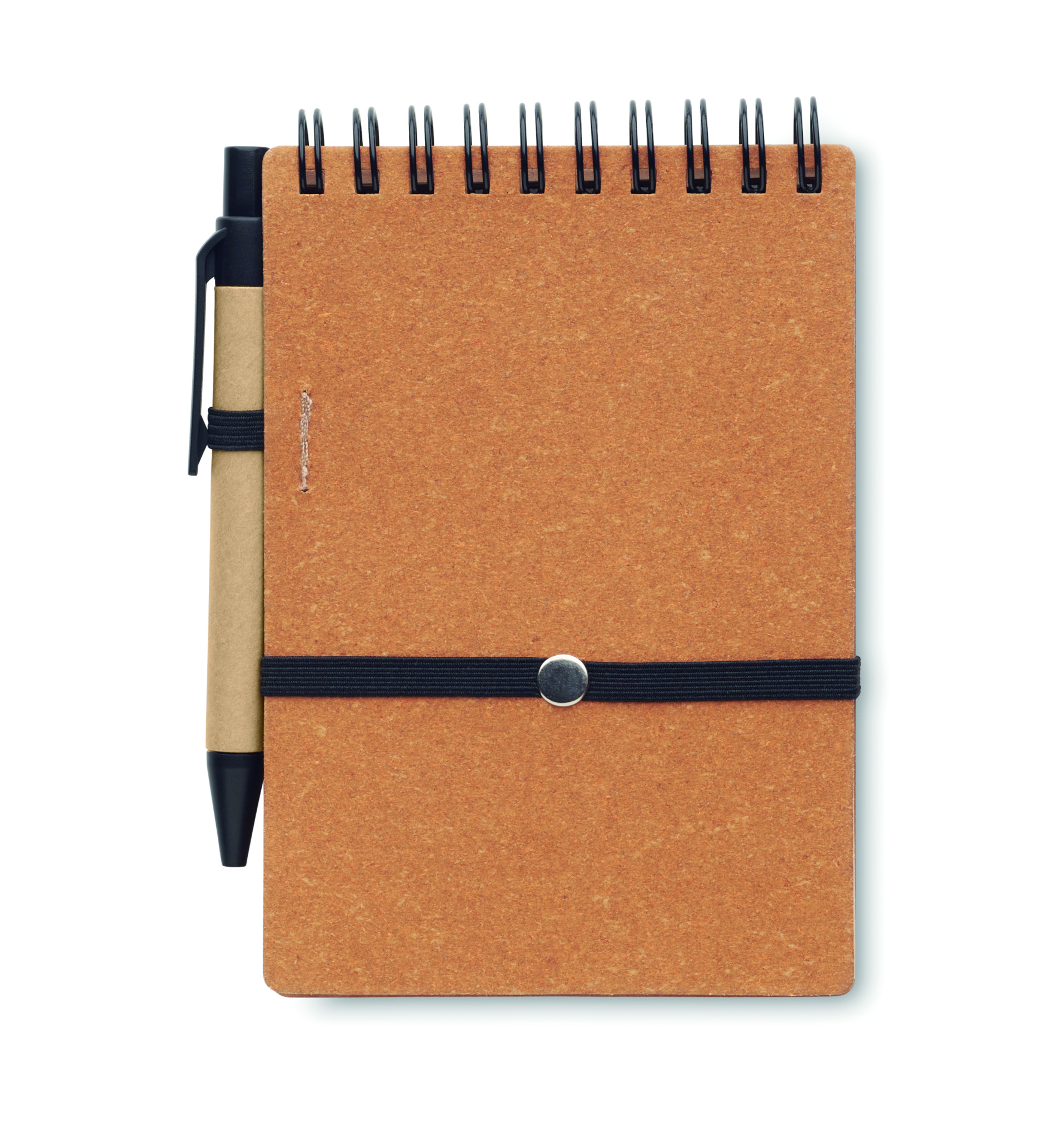 Anteckningsblock med omslag av återvunnet papper och PU (70% återvunnet papper och 30% PU). Ringbunden. 140 linjerade sidor av återvunnet papper (70 ark). Matchande penna i återvunnen kartong och ABS-delar. Blått bläck. Elastiskt stängningsband och pennhållare.