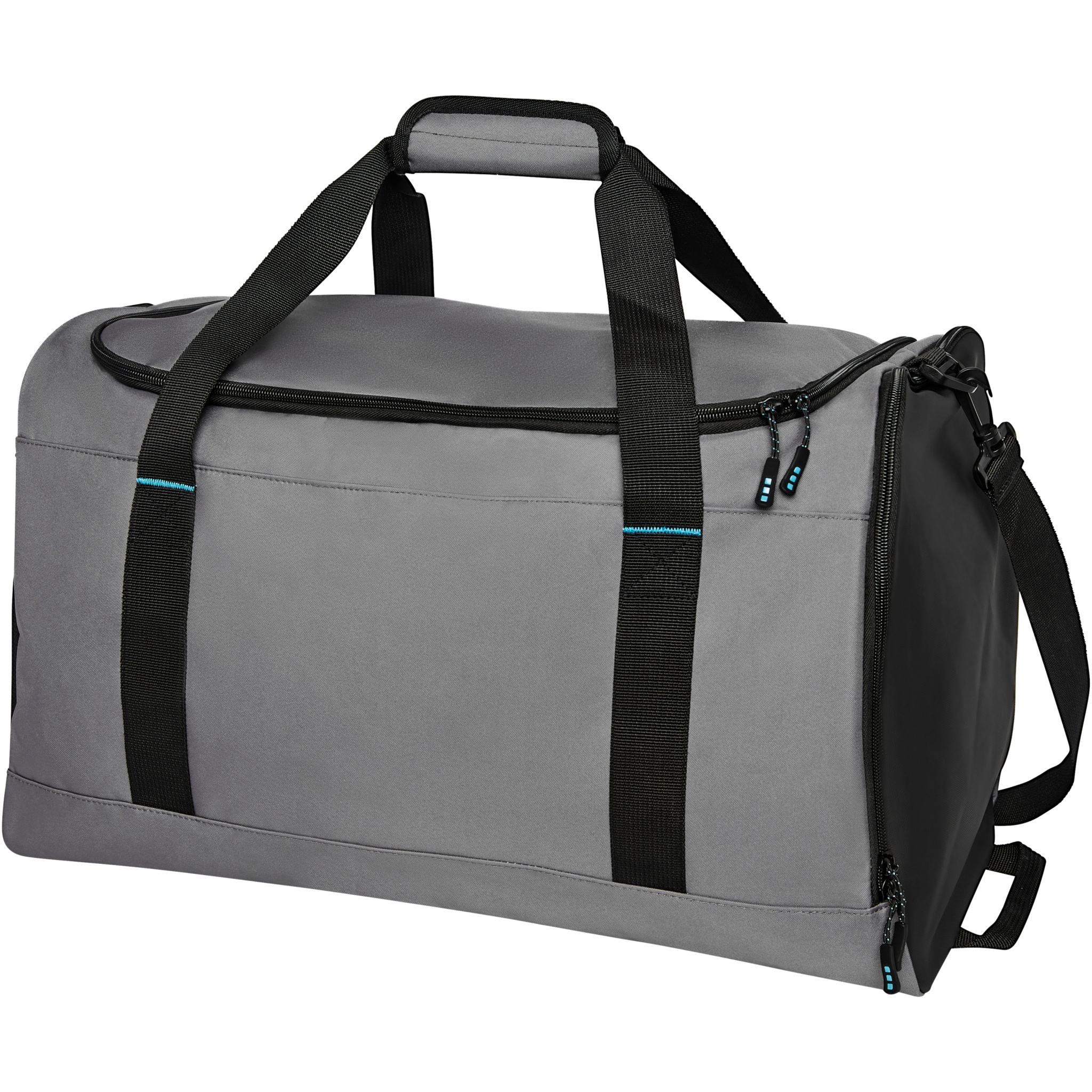 Hållbar GRS-certifierad RPET-duffelväska tillverkad med 55 % återvunnet material. Utrustad med ett stort huvudfack med blixtlås, en förstärkt baspanel, en nätficka på sidan, och en expanderbar våt/torr blixtlåsförsedd ficka. Levereras med en liten innerficka med dragkedja för organisering, avtagbar och vadderad axelrem, grepphandtag med vadderad kardborrestängning och ett extra grepphandtag på den nedre högra sidan.