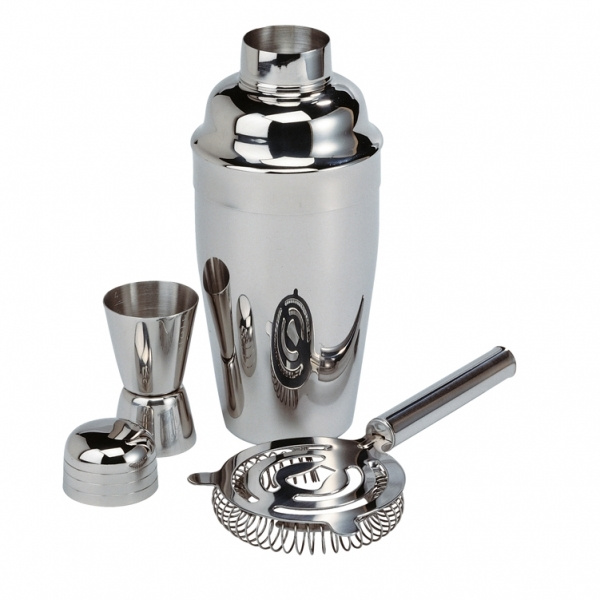 Skakad, inte omrörd! Med detta högkvalitativa kromade cocktailset kommer du att blanda som en professionell barman. Setet innehåller 1 shaker, 1 mätkanna och 1 sil med 2 stöd. Silen passar storleken på glaset tack vare dess spiral, så att all större frukt eller isbitar hålls borta från glaset vid upphällning. Rostfritt rostfritt stål gör kvalitetssilar oförstörbara. Vi kommer att placera din logotyp med hjälp av lasergravering på shakern. Varje set är förpackat i en presentförpackning.