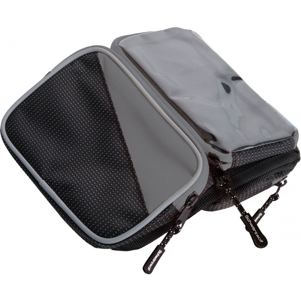Kompakt Schwarzwolf cykelväska med telefonficka. Väskan har två sidfickor med dragkedja och en genomskinlig avtagbar telefonficka. Innermått på väskan: 8 x 16,5 x 2 cm. Förpackad i en Schwarzwolf-låda.