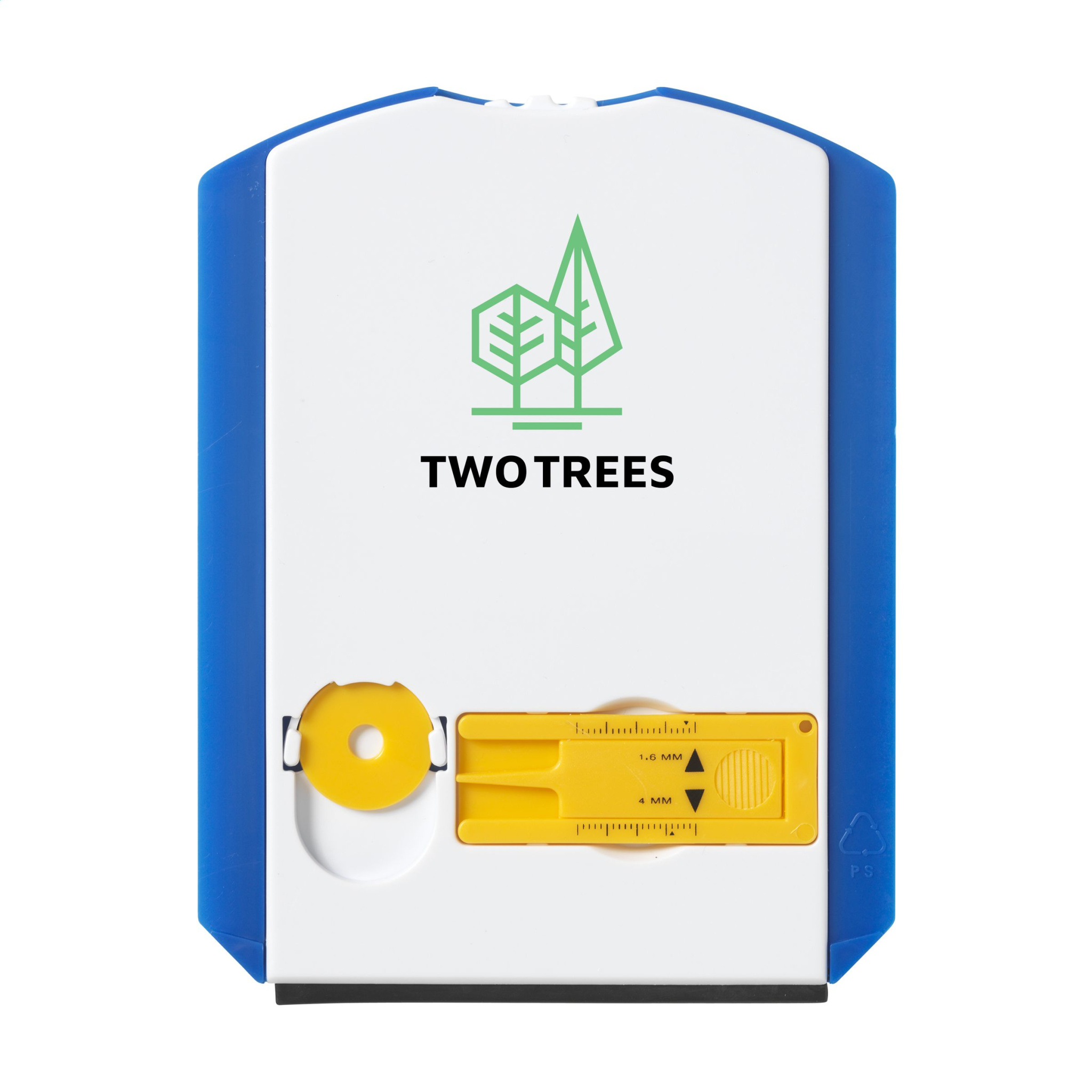 Parkeringsskiva av slitstark plast med isskrapa, gummitorkare, vagnmynt och däckmönsterdjupsmätare.