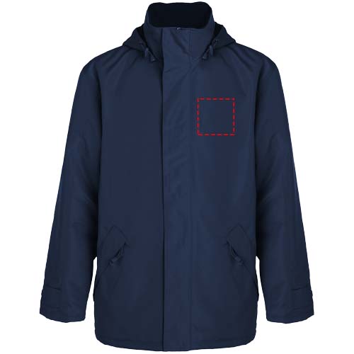 Vadderad vattentät jacka. Gjuten dragkedja mitt fram med matchande löpare. Hög hals med vikbar huva. Sidfickor med dragkedja och löpare. Justerbara muddar med remmar. Två innerfickor med kardborrband. Innertyg med dragkedja. Vattentät. Vindtät. Modellen är 184 cm och bär storlek L.