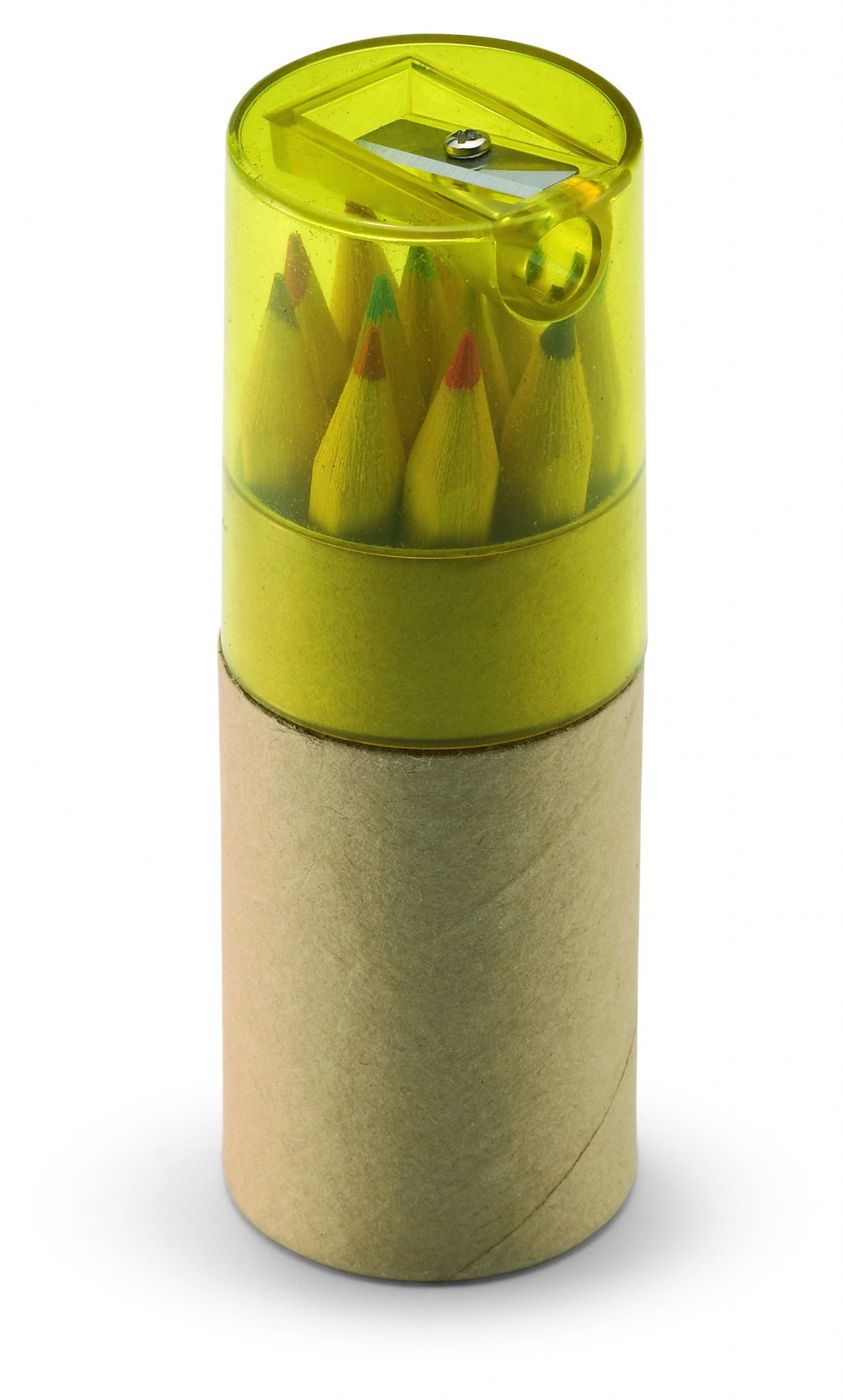 12 färgade trä blyertspennor i tub. Pennvässare i transparent lock.