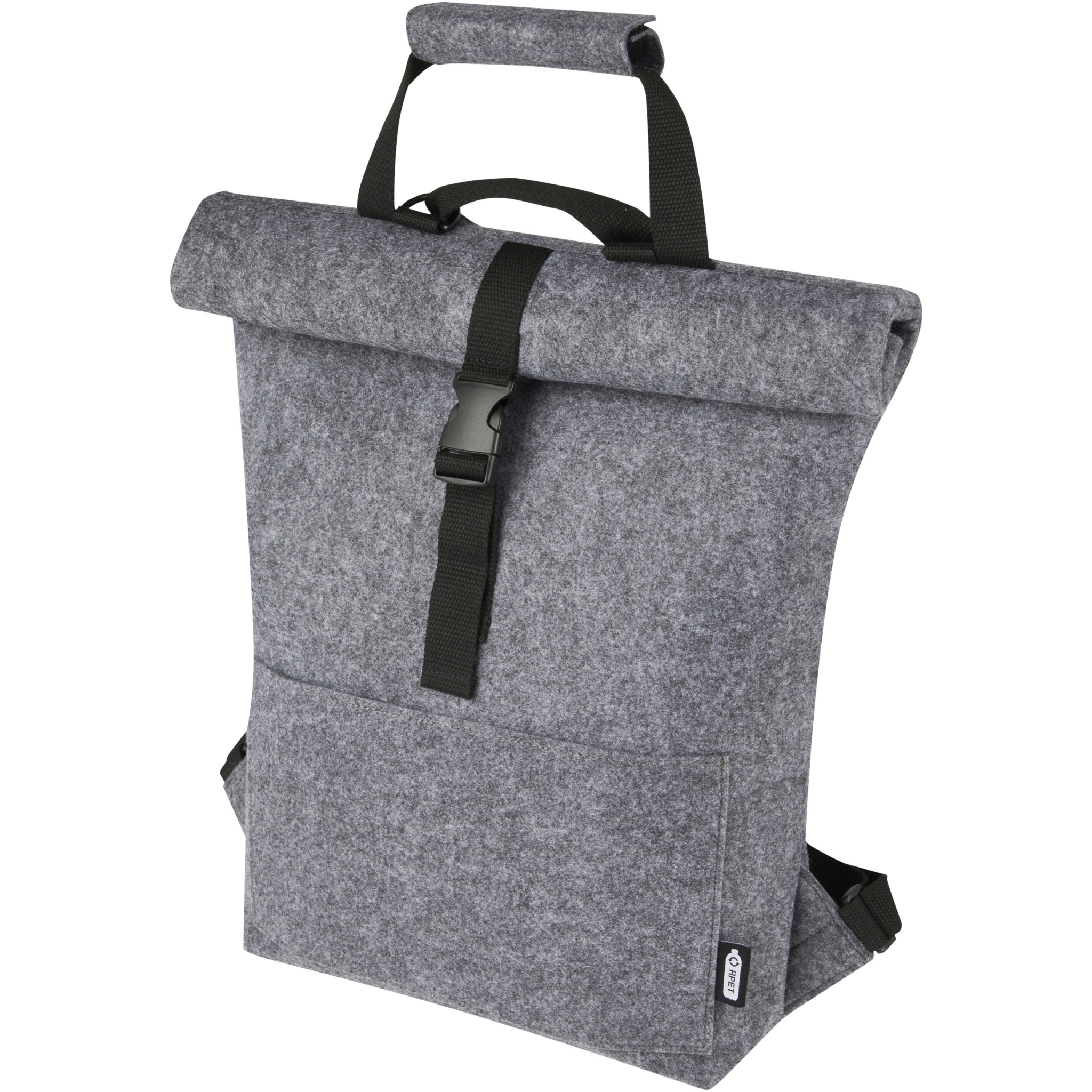 Multifunktionell och trendig kombinerad ryggsäck och cykelväska med rullöppning tillverkad av högkvalitativ, mjuk och hållbar GRS-certifierad återvunnen filt. Har ett stort huvudfack, framficka, justerbara axelremmar och tre kardborreband för att fästa väskan bak på en cykel. Axelremmarna kan enkelt göras om till ett system med långa bärhandtag eller buntas ihop så att remmarna inte fastnar i ett cykelhjul.