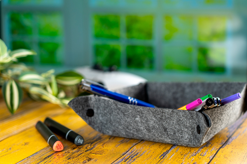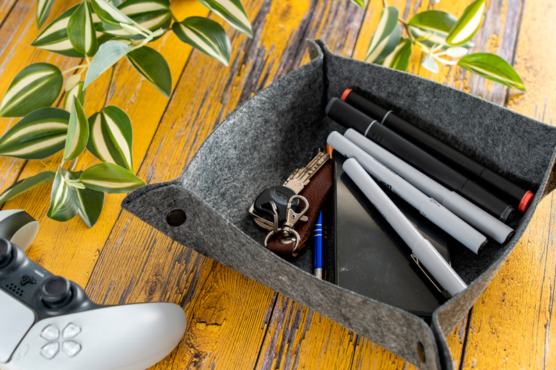 Förvaringsskål gjord av återvunnen filt. Tack vare de praktiska tryckknapparna kan skålen snabbt förvaras eller ställas platt. Vikt skål mått 15 x 15 cm.