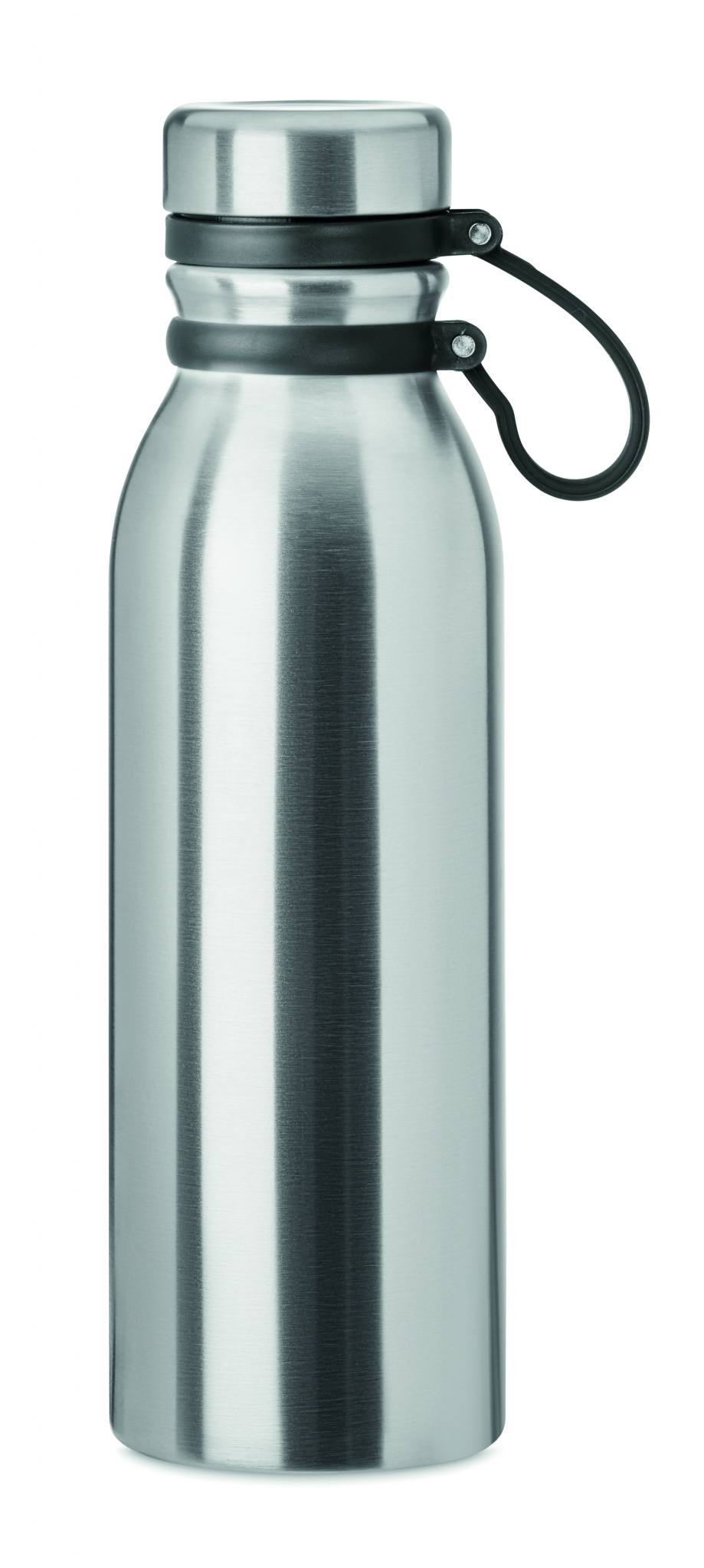 Flaska med dubbelvägg i rostfritt stål och silikongrepp som gör den lätt att bära. Fri från BPA. Läckagefri. Kapacitet: 600 ml. Läckagefritt.