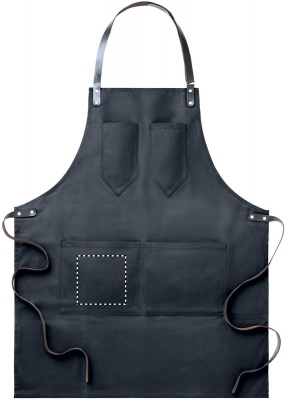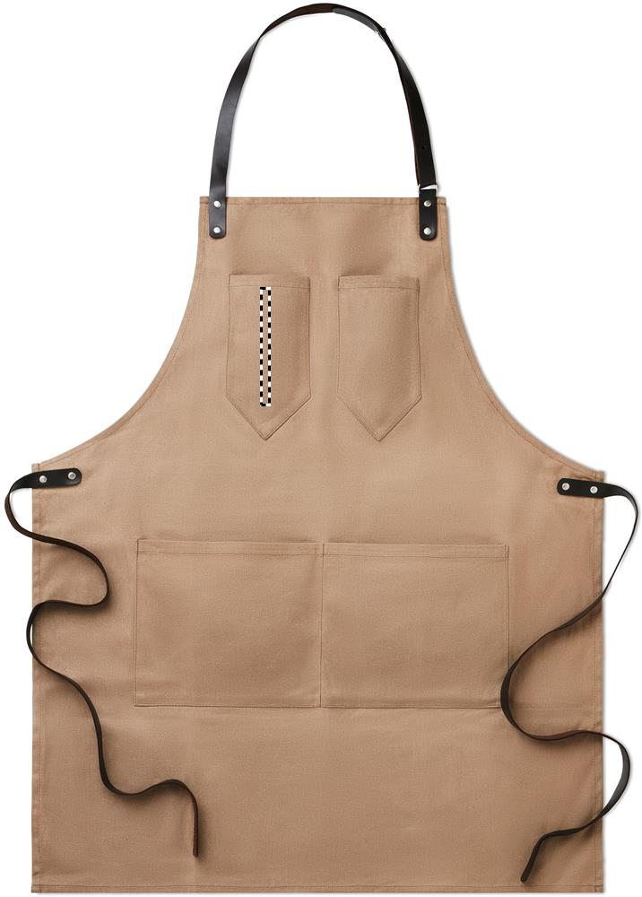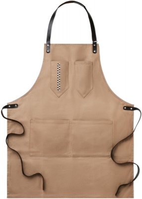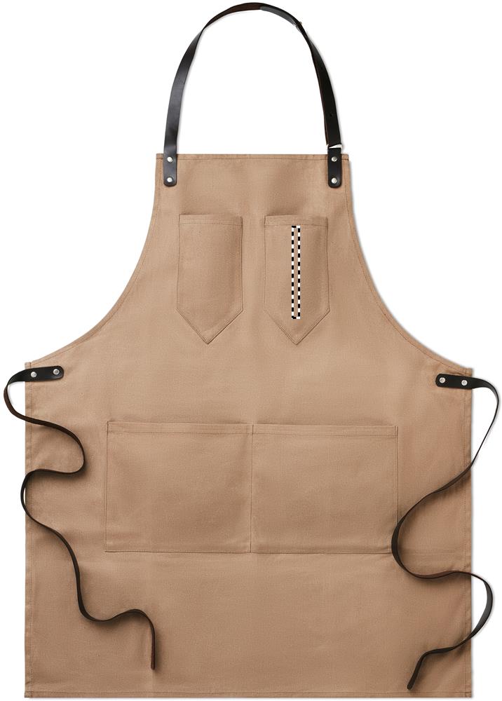 Förkläde i vaxad canvas med läderdetaljer, justerbart band med 2 bröstfickor och 1 stor ficka nedtill.