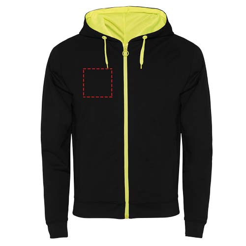 Sweatjacka i icke-borstad fleece med detaljer i fluoriserande färg. Centralt blixtlås med kontrastfärgad dragkedja. Huva med foder i mikroperforerat polyestertyg och kontrasterande fluoriserande färg. Dragsko och metallöglor i kontrasterande fluoriserande färg. 1 x 1 ribbade muddar och midja. Två framfickor med bred kant. Förstärkta täckta sömmar i innerkragen. Avtagbar etikett.