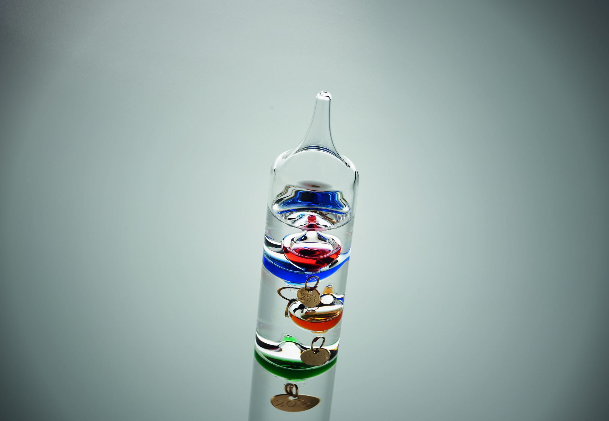 Galileo termometer i glas med fem färgade, flytande glober. Varje glob indikerar temperaturen från 18°c till 26°: Röd 26°, kunglig blå 24°, orange 22°, grön 20° och lila - 18°. Den lägsta globen i den översta gruppen anger omgivningstemperaturen.