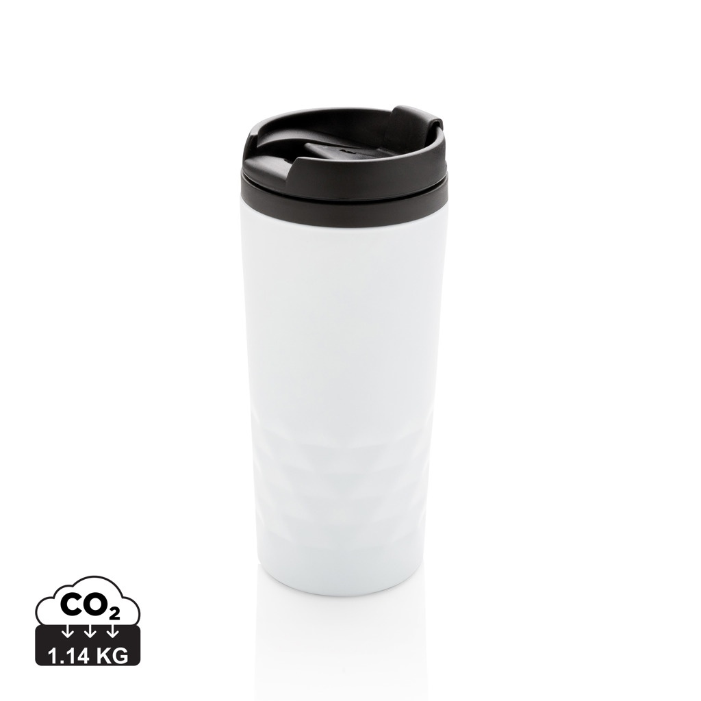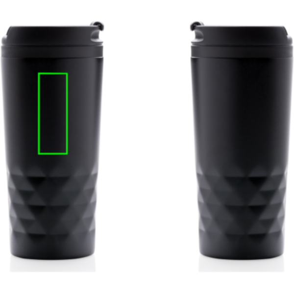 Trendig termosmugg med geometriska detaljer i rostfritt stål. Insida av plast. Endast handdisk. Volym 300 ml.