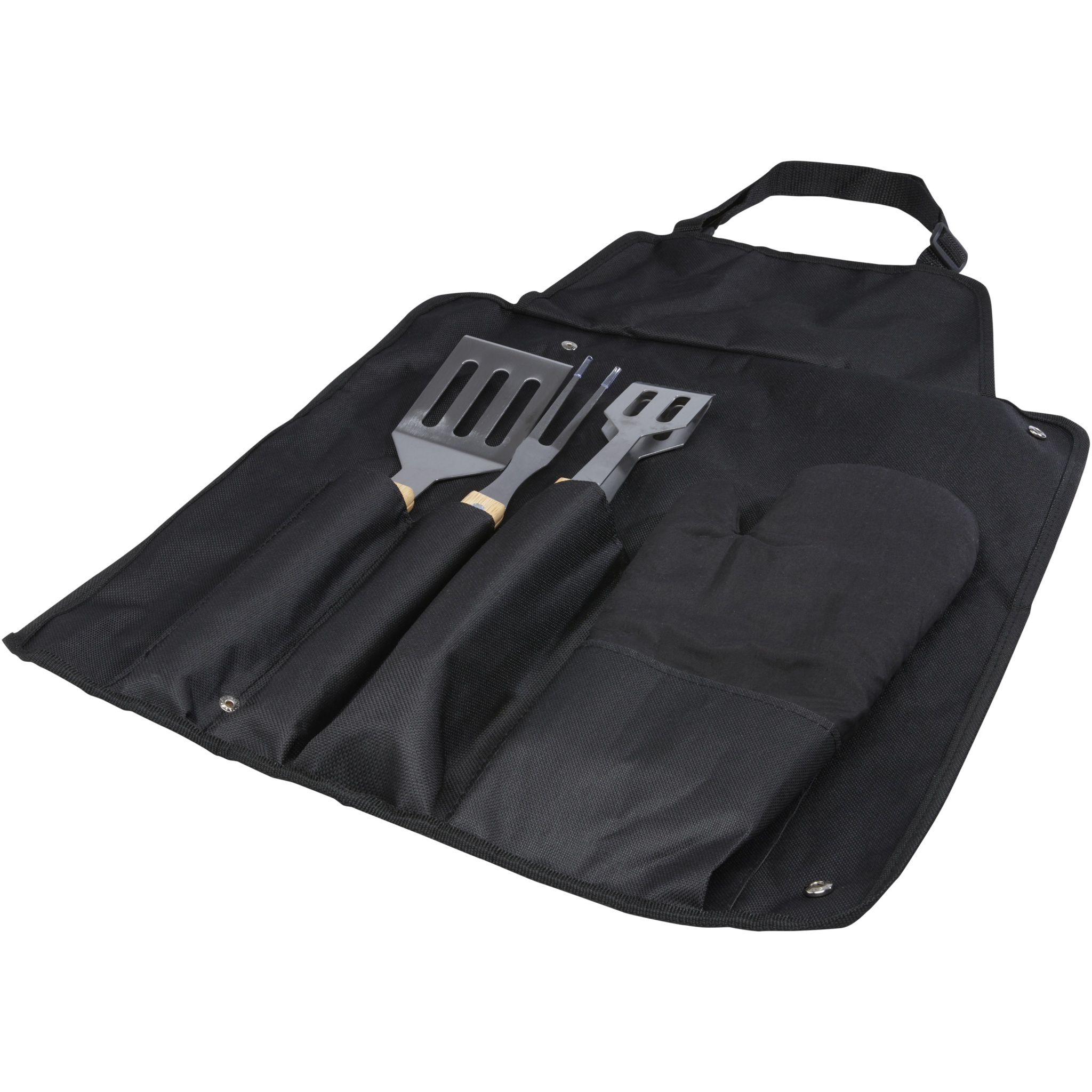 Grillset med 5 delar med en spade (36,5 x 7 cm), gaffel (36,5 x 2 cm), tång (36,5 x 5 cm), handske (25 x 16 cm) och ett förkläde inklusive påse (42 x 60 cm). Handtagen är tillverkade av bambu som kommer från och produceras enligt hållbara standarder.