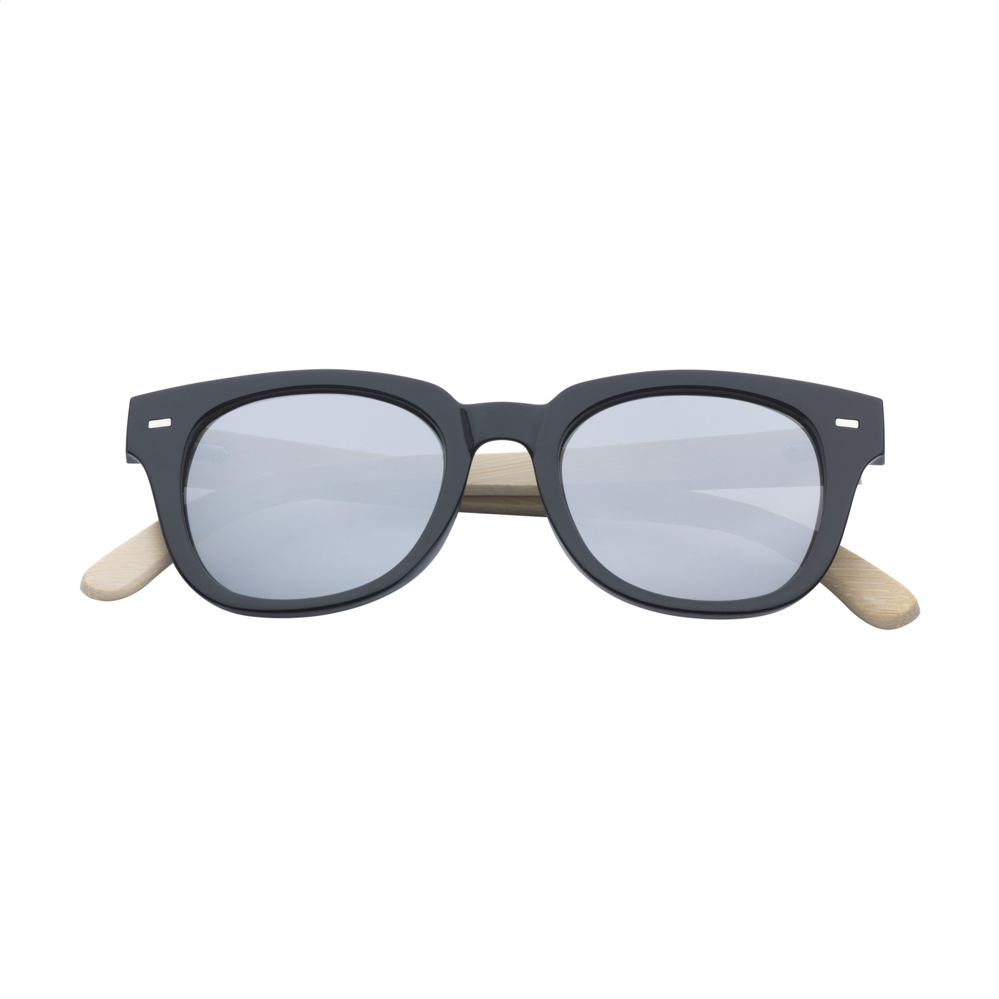 Slående solglasögon med spegelglas. Ramen på detta klassiska par är gjord av robust plast med armar gjorda av bambu. Spegelglasen har UV400-skydd i linje med europeiska standarder. Varje artikel levereras i en individuell brun kartong.