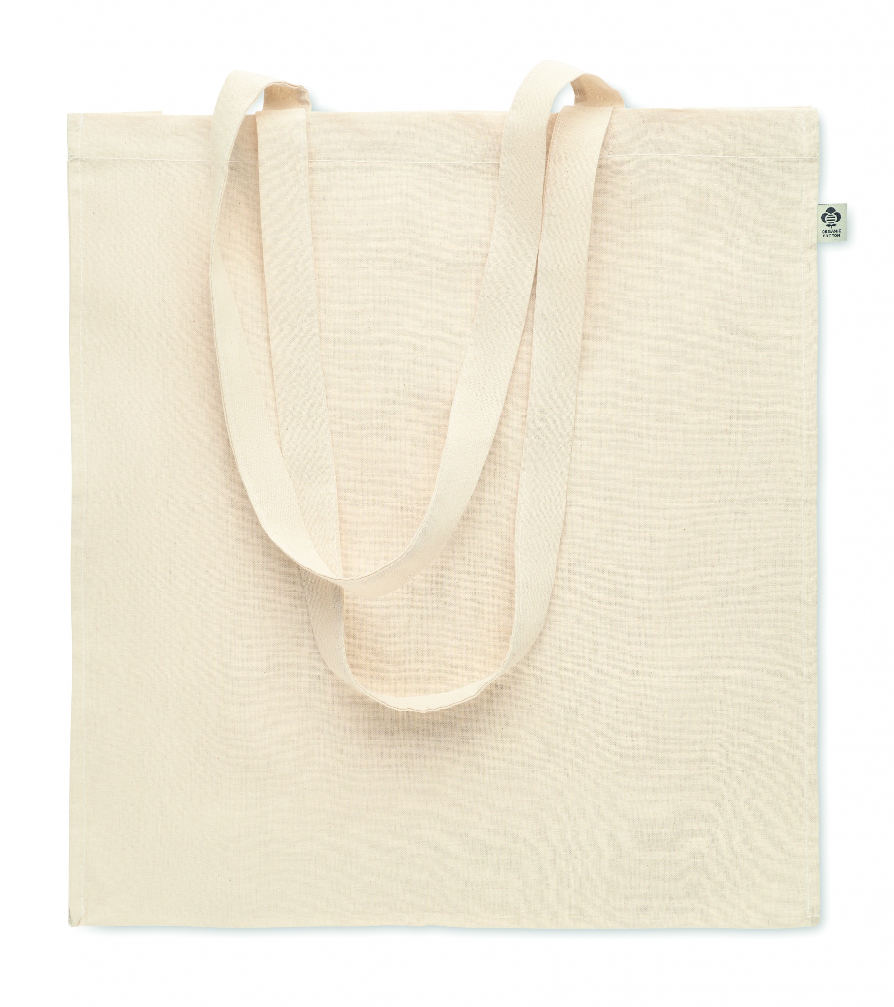 Kasse i ekologisk bomull medbälg och långa handtag. 140 gr/m².