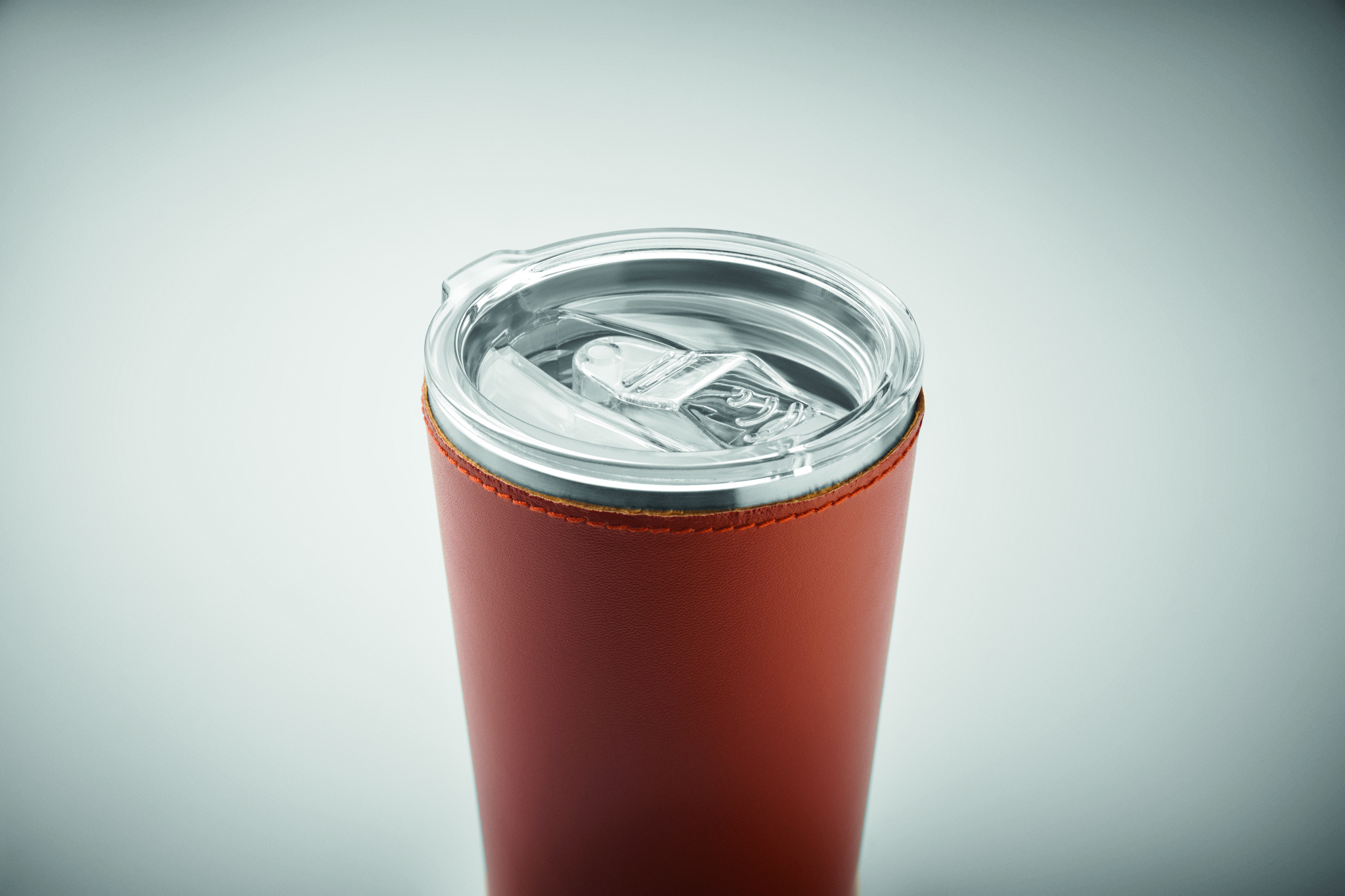 Dubbelväggig mugg i återvunnet rostfritt stål (90% återvunnet rostfritt stål och 10% rostfritt stål) med avtagbart PU-läderhölje. Lock med skjutbart drickhål. Läckagesäker. Volym: 350 ml.
