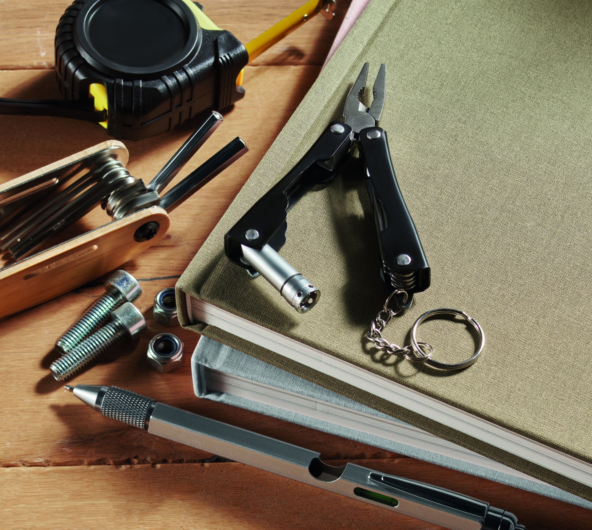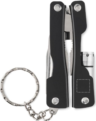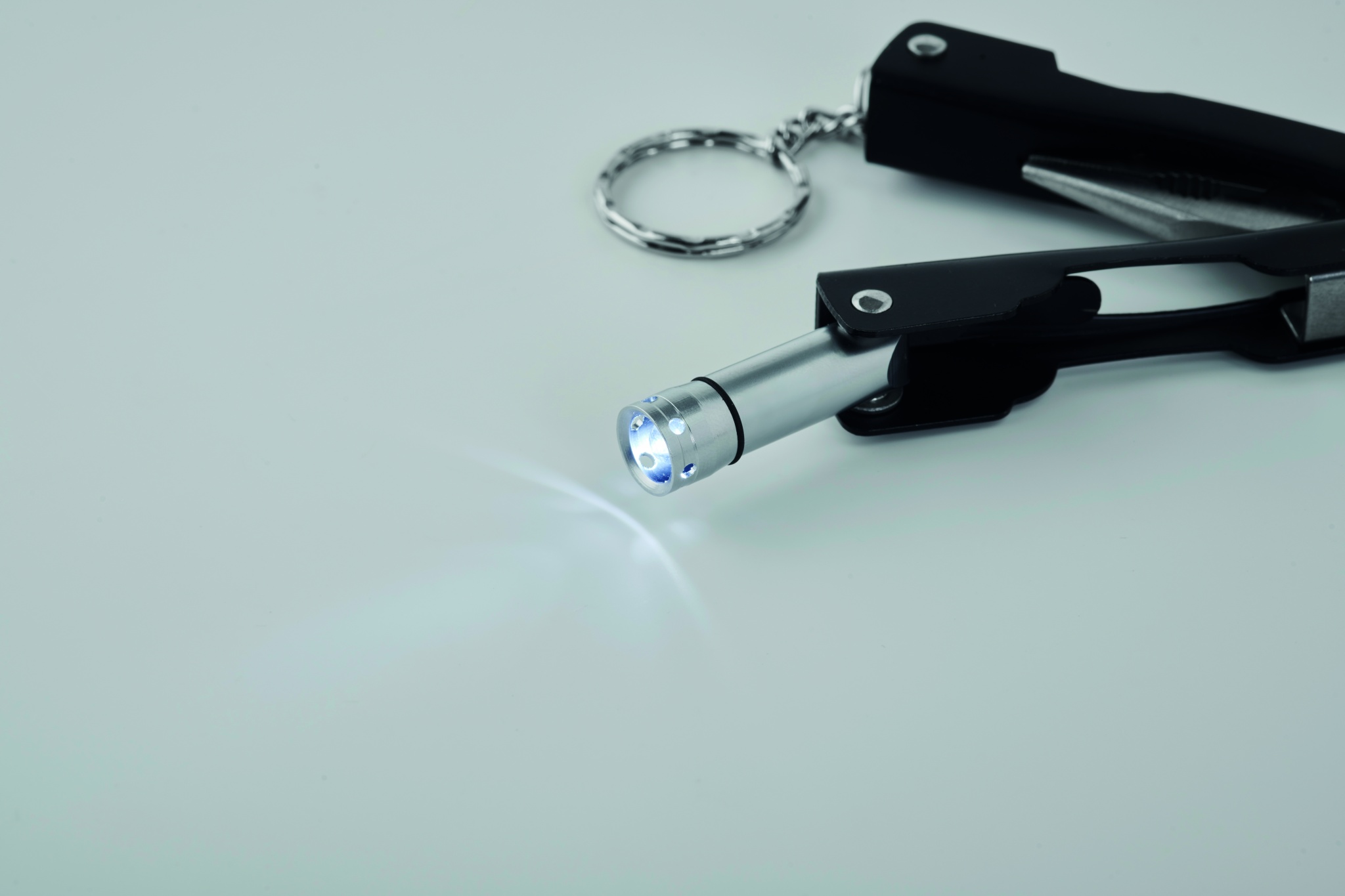Vikbar multiverktygskniv med ficklampa i rostfritt stål. Innehåller 10 verktygsfunktioner samt väska i 600D polyester. Inklusive 3 x AG3 knappceller.