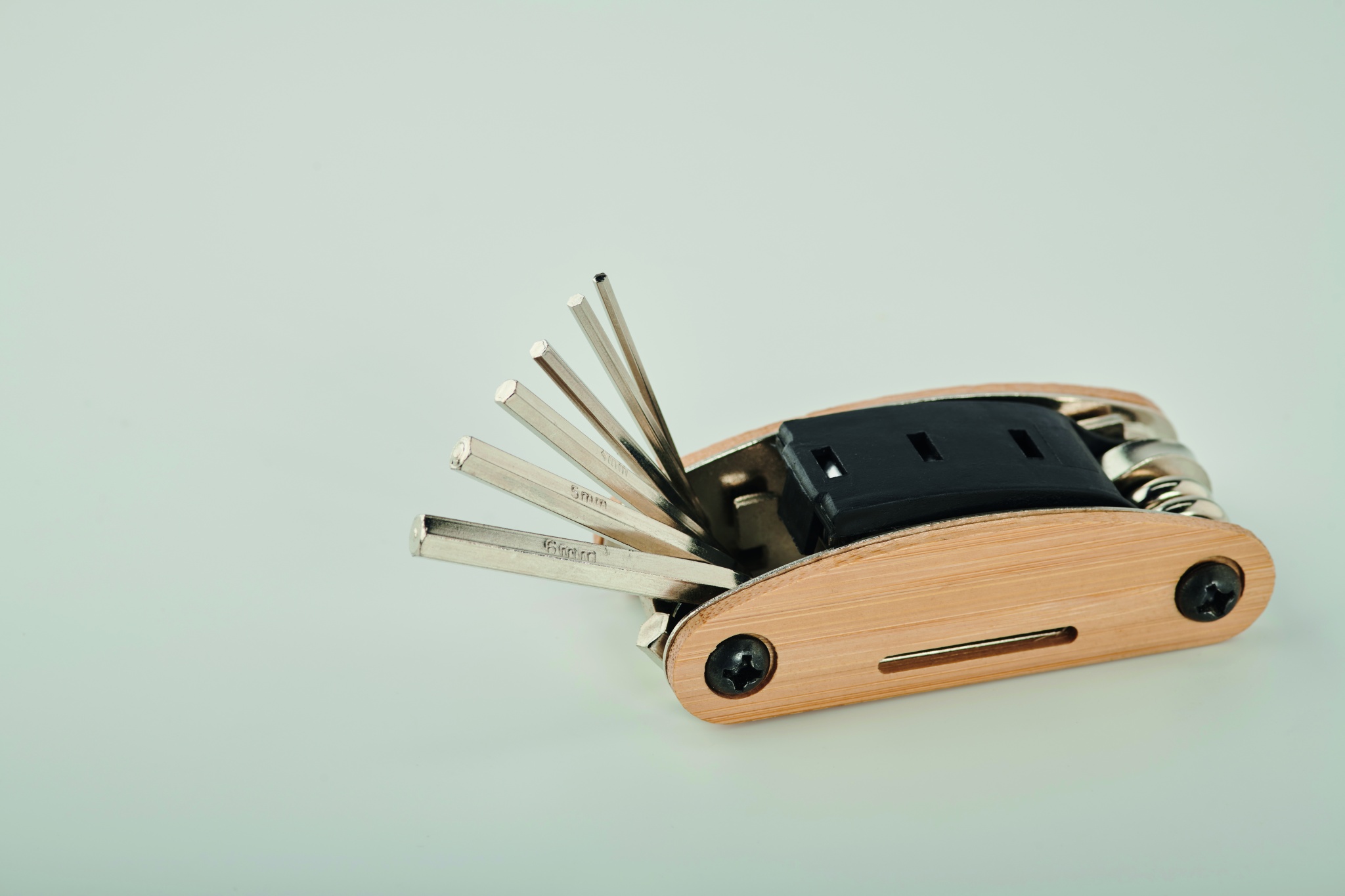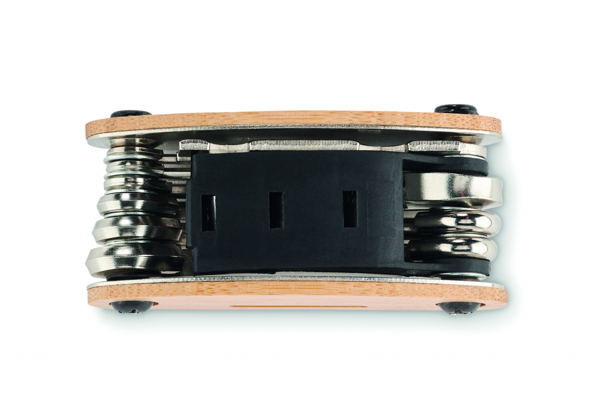 Multifunktionellt fickverktyg i rostfritt stål med bambuöverdrag. 11 funktioner. Innehåller: insexnyckel, skiftnyckel, hylsförlängare, stjärnskruvmejsel och hylsnyckel.