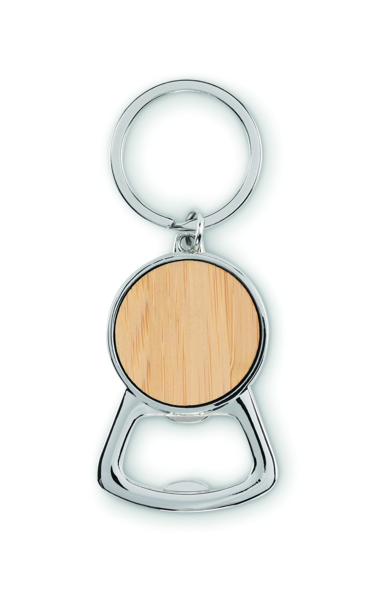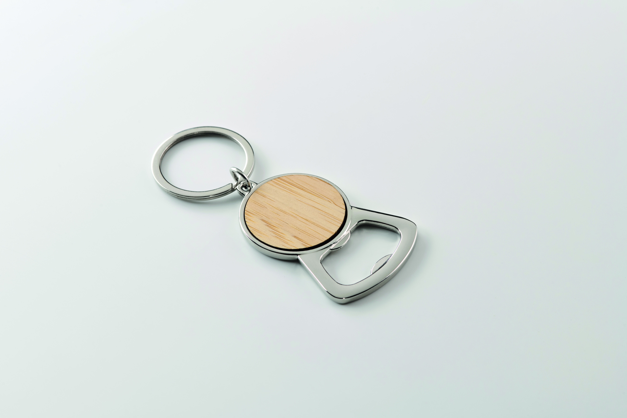 Nyckelring med flasköppnare i metall med bambu-detaljer.