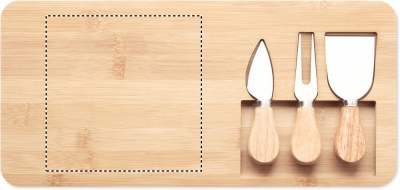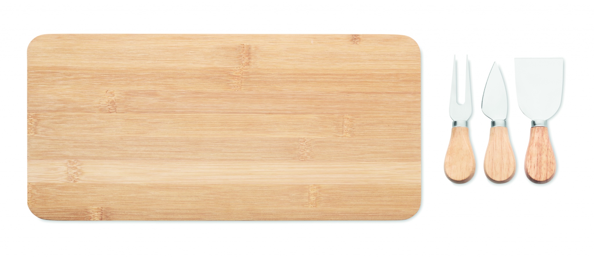 Serveringsbräda i bambu med ostset med 2st serveringsknivar och en gaffel.