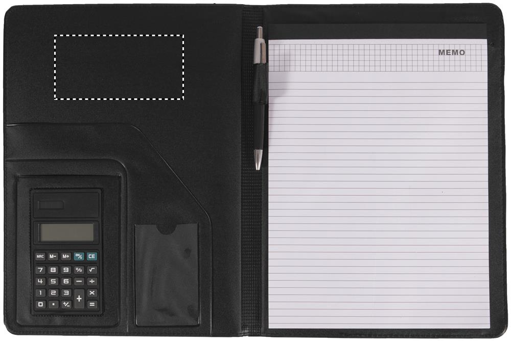 A4 konferensmapp i imitationsläder med solenergi miniräknare, kulpenna med blått bläck och 20 sidigt linjerat anteckningsblock.