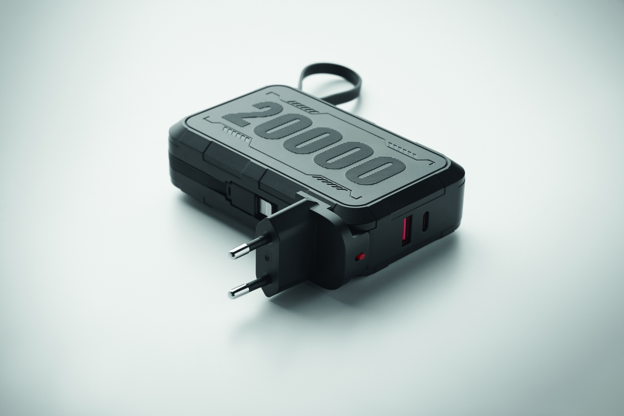 Powerbank 20000 mAh i ABS med inbyggd US-kontakt och löstagbar AC-kontakt. USB A och typ-C in/ut. Integrerade kablar med typ-C och 2 i 1 stift.