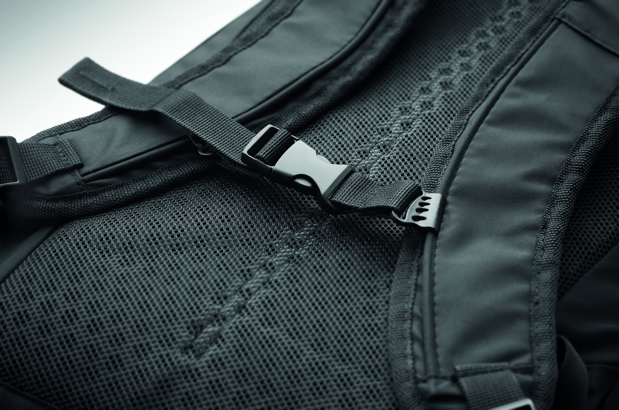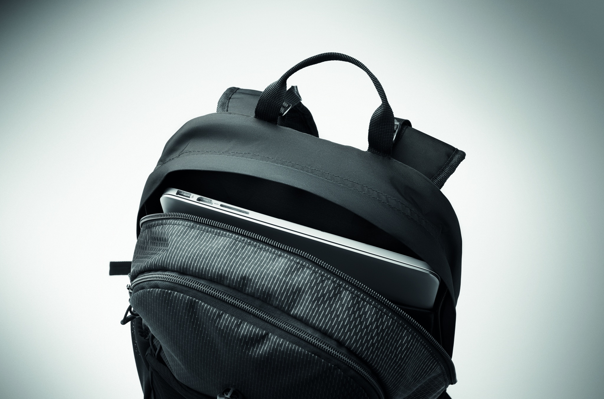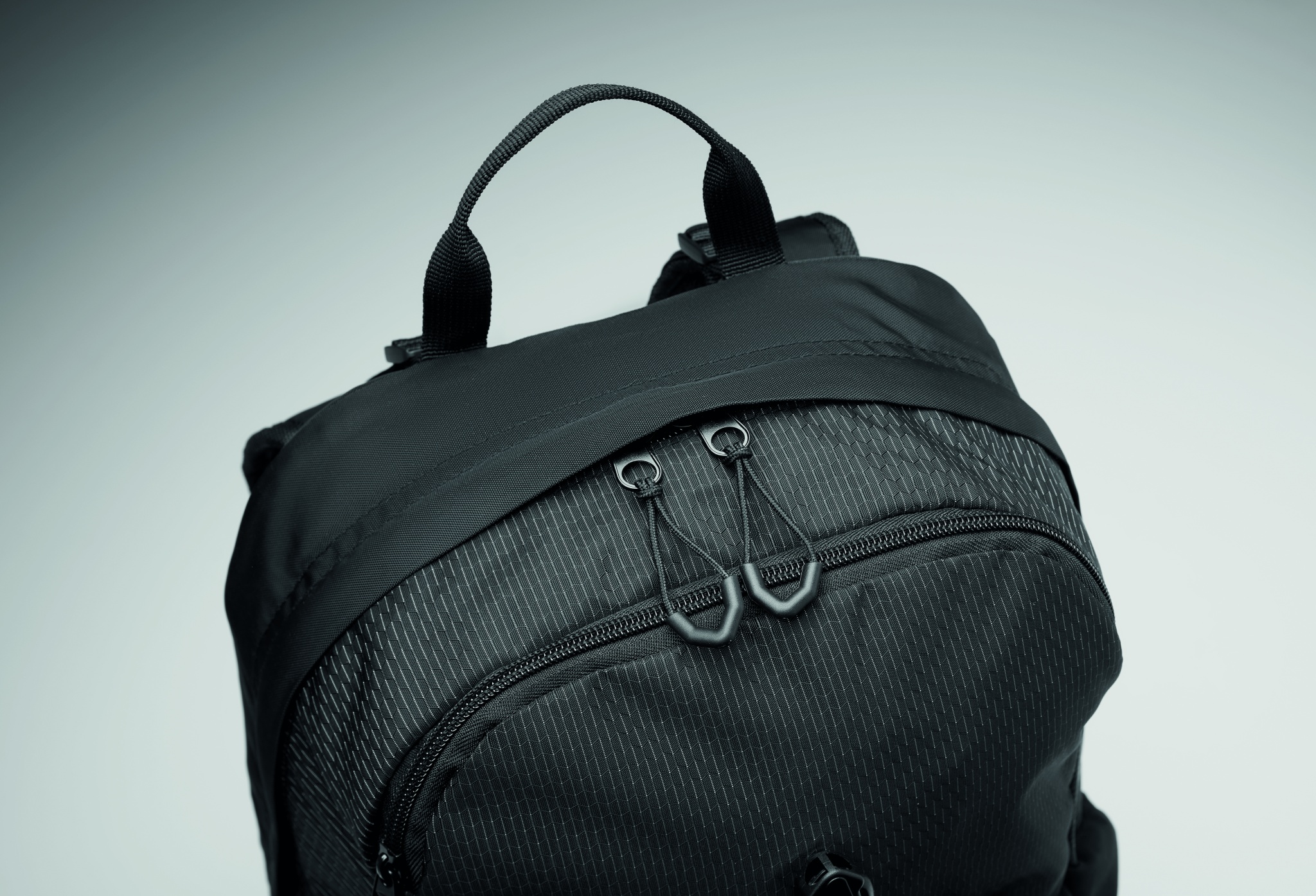 Ryggsäck 18L i vattenavvisande 420D nylon med reflekterande rand och inre 15'' laptopfack. Ett främre fack med dragkedja och en främre öppen ficka med spänne. Två sidofickor. Vadderade rygg- och axelremmar. Ventilerad baksida.
