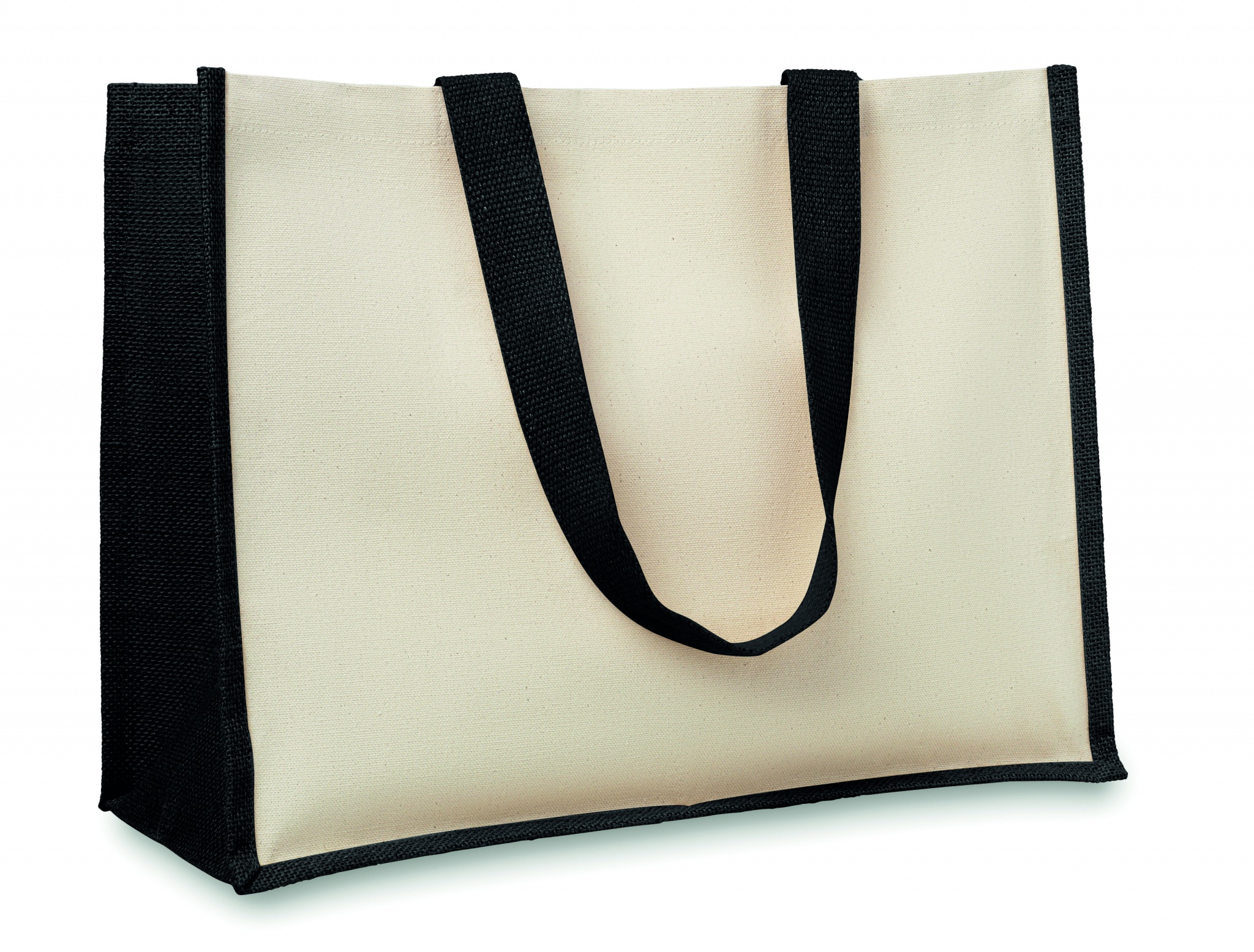 Shoppingkasse i laminerad Jute med front i canvas och bomull. Långa handtag.