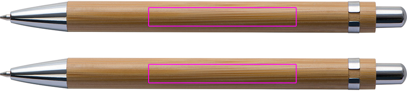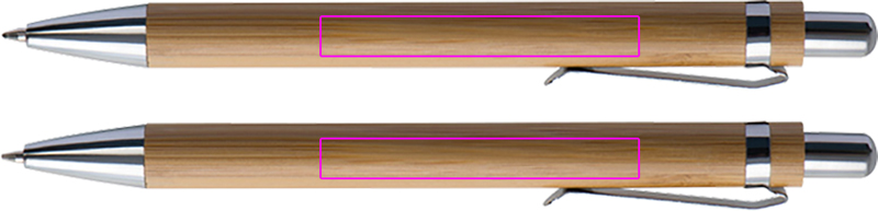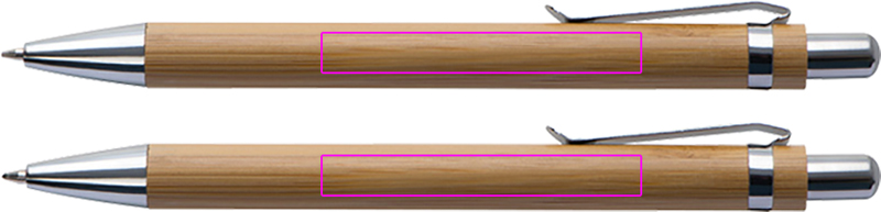 Skrivset av bambu, inklusive en blåskrivande kulpenna och en mekanisk penna i en kartong. Vi graverar din logotyp under klämman på båda pennorna.