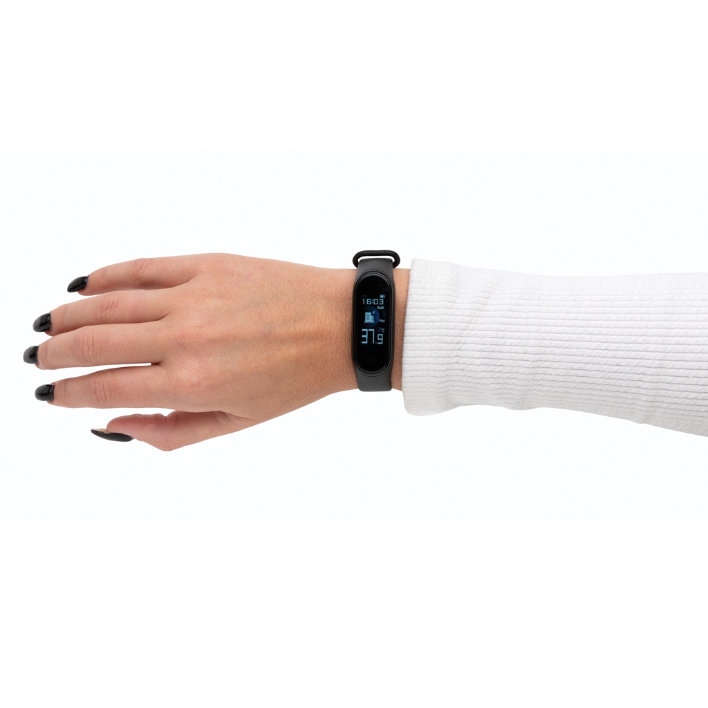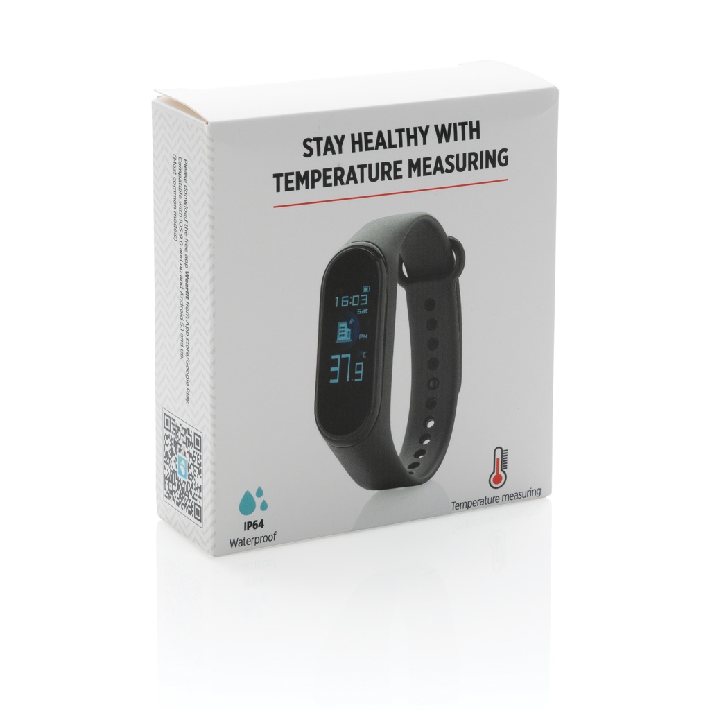 Håll koll på din kroppstemperatur och din allmänna hälsa med detta armband med integrerad kroppstemperatursensor (upp till max 0,2 grader felmarginal). Armbandet har en 0’96 TFT färgskärm. Funktioner: BT 4.2, IP67 vattentät, inkommande samtal/meddelanden, stoppur, multi-sport, kaloriförbränning, stegräknare och sömnregistrering. Armband i mjuk TPU, bekvämt att bära hela dagen. Batteriet på 90 mAh har en standby-tid på upp till 5 dagar.