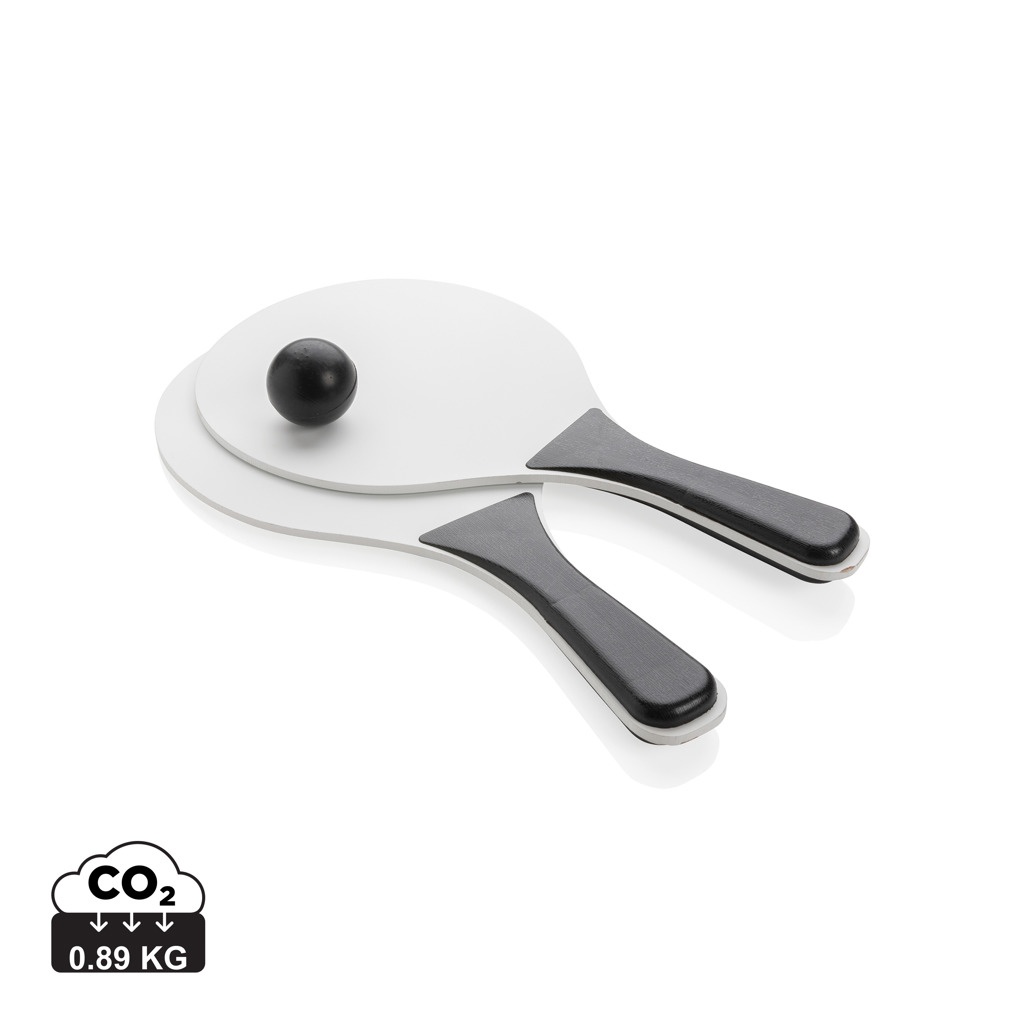 Strandtennis-set i MDF med handtag i PP. Förpackat i nät, 1 boll medföljer.