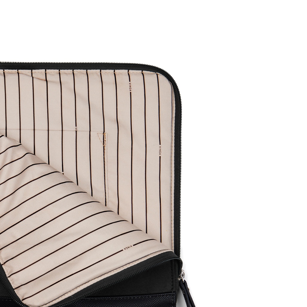 Skydda din dator med stil med detta stilrena vadderade fodral. Med en extra lång dragkedja för enkel åtkomst. På insidan finns en praktisk ficka för mindre föremål. Observera: Displaymått kan variera från måtten på den bärbara datorn. Marlow-serien är tillverkad i återvunnen mockaimitation med PU-detaljer och foder i återvunnen polyester. Försedd med snygga silverfärgade beslag. Certifierad enligt RCS (Recycled Claim Standard), RSC-certifiering garanterar att hela leveranskedjan av återvunnet material är certifierad. Det totala återvunna innehållet baseras på produktens totala vikt. Denna produkt innehåller 49% RCS-certifierad återvunnen polyester och 3% RCS-certifierad återvunnen polyuretan.