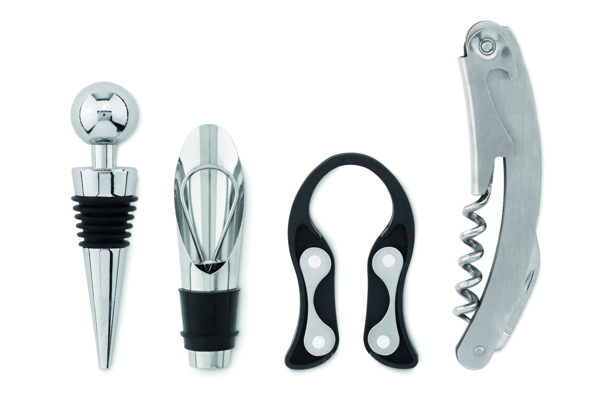 Vinställ i trä med 4 vintillbehör. Innehåller: servitörkniv, vinförslutare, vinhällare/dekanterare med stopp och folieskärare.