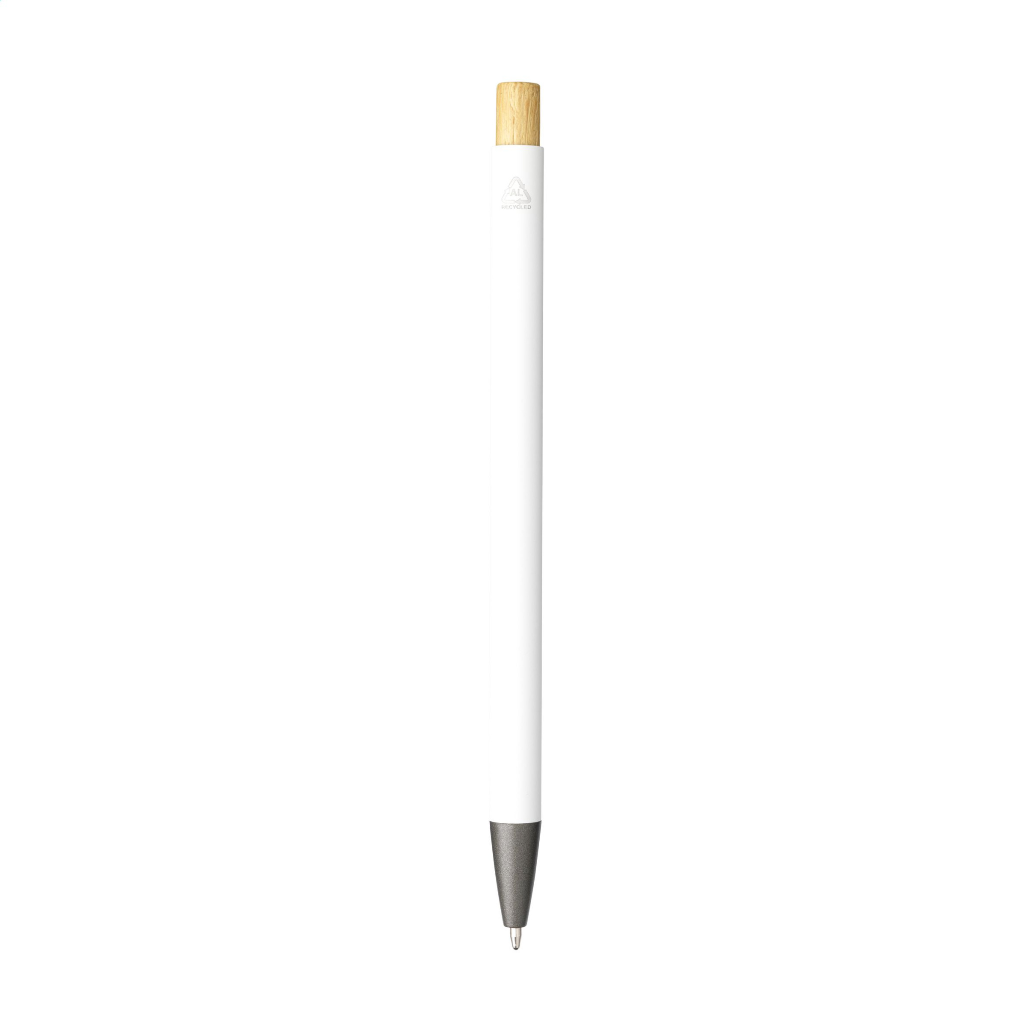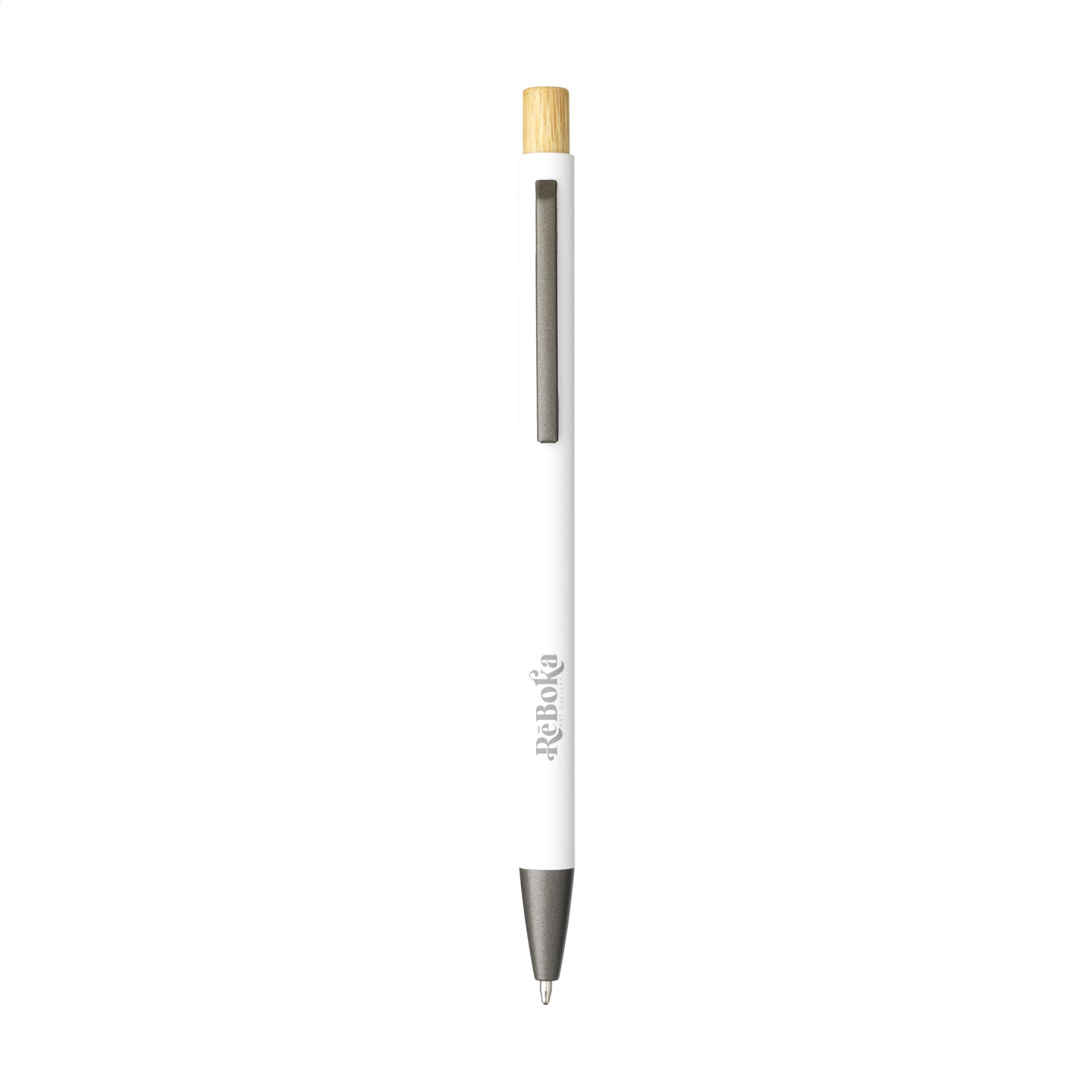 WoW! Blått bläck, slimmad kulspetspenna med cylinder gjord av återvunnet aluminium med en gummerad yta. Metallklämma. Snygg design. Bambutryckknappen ger pennan en naturlig touch. GRS-certifierad. Totalt återvunnet material: 78%. Användningen av återvunnet aluminium gör att färre nya råvaror används i produktionen. Det innebär mindre energiförbrukning och mindre användning av vatten. Ett ansvarsfullt val.